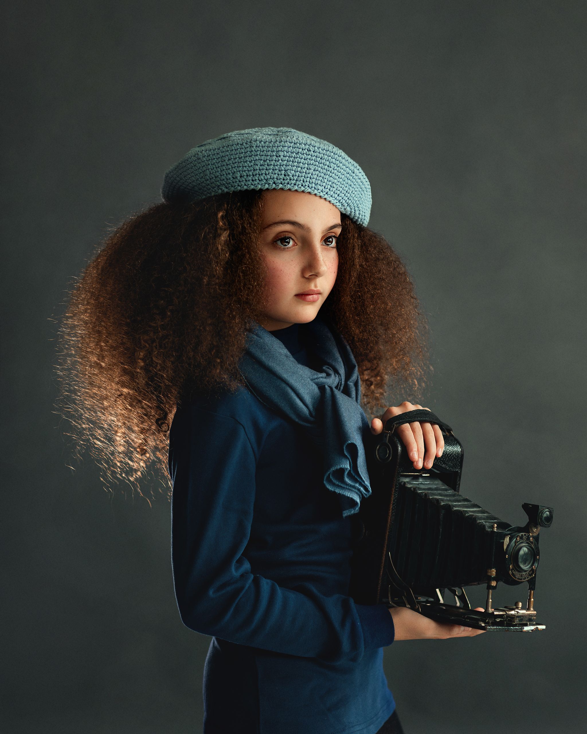 Елена, портрет выдержан в сдержанной гамме — тёмный фон, глубокий синий наряд, акцент на текстурах. Девушка с камерой — как будто застыла в моменте, готовая к съёмке, но и сама — объект искусства. Крепкий кадр, сдержанная выразительность. 📸