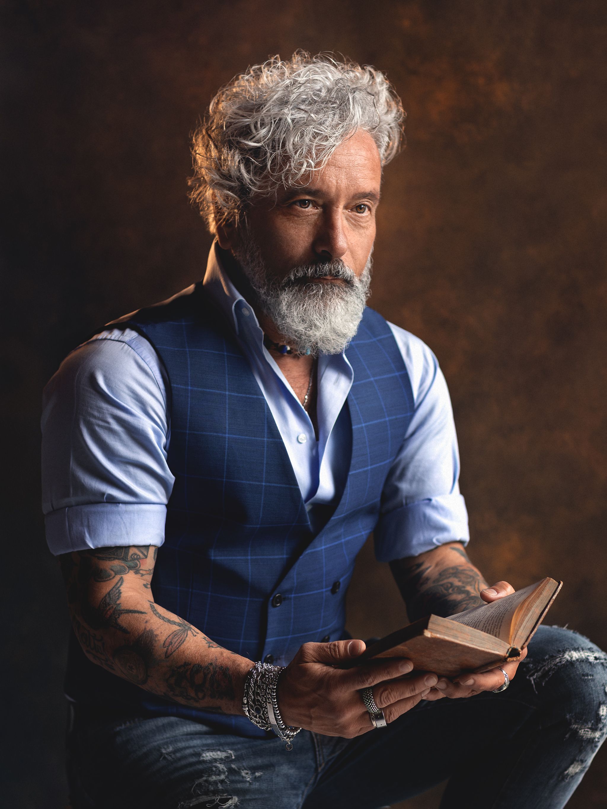 Елена, мужчина с книгой — как будто время остановилось: волнистые седые волосы, татуированные руки, глубокий взгляд — всё это создаёт атмосферу мудрости и внутренней силы. 📖✨