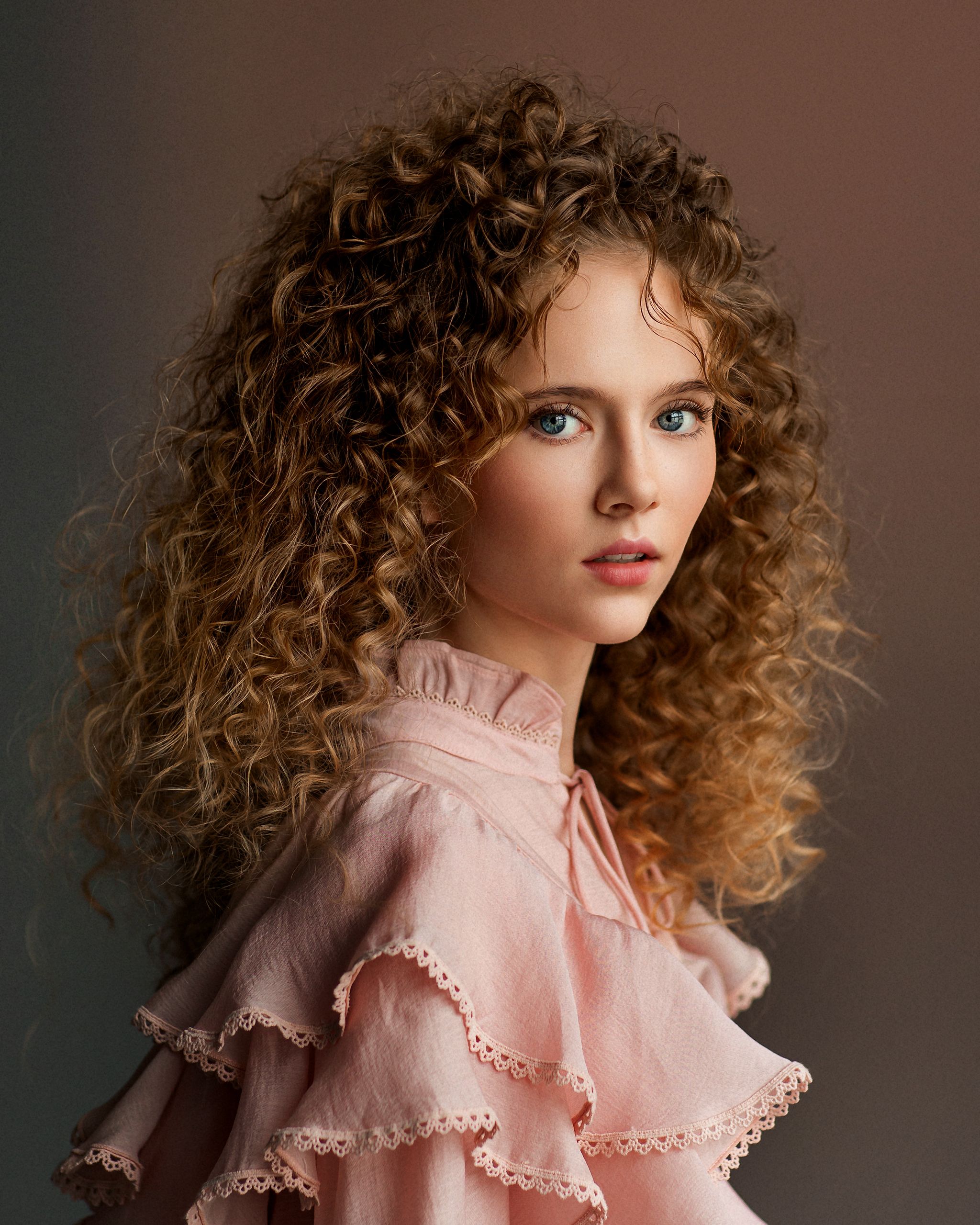 Фотография передаёт нежность и естественность — волосы с живыми завитками, взгляд открытый, одежда мягко подчёркивает образ. Хорошее освещение и тёплый фон создают уютную атмосферу.