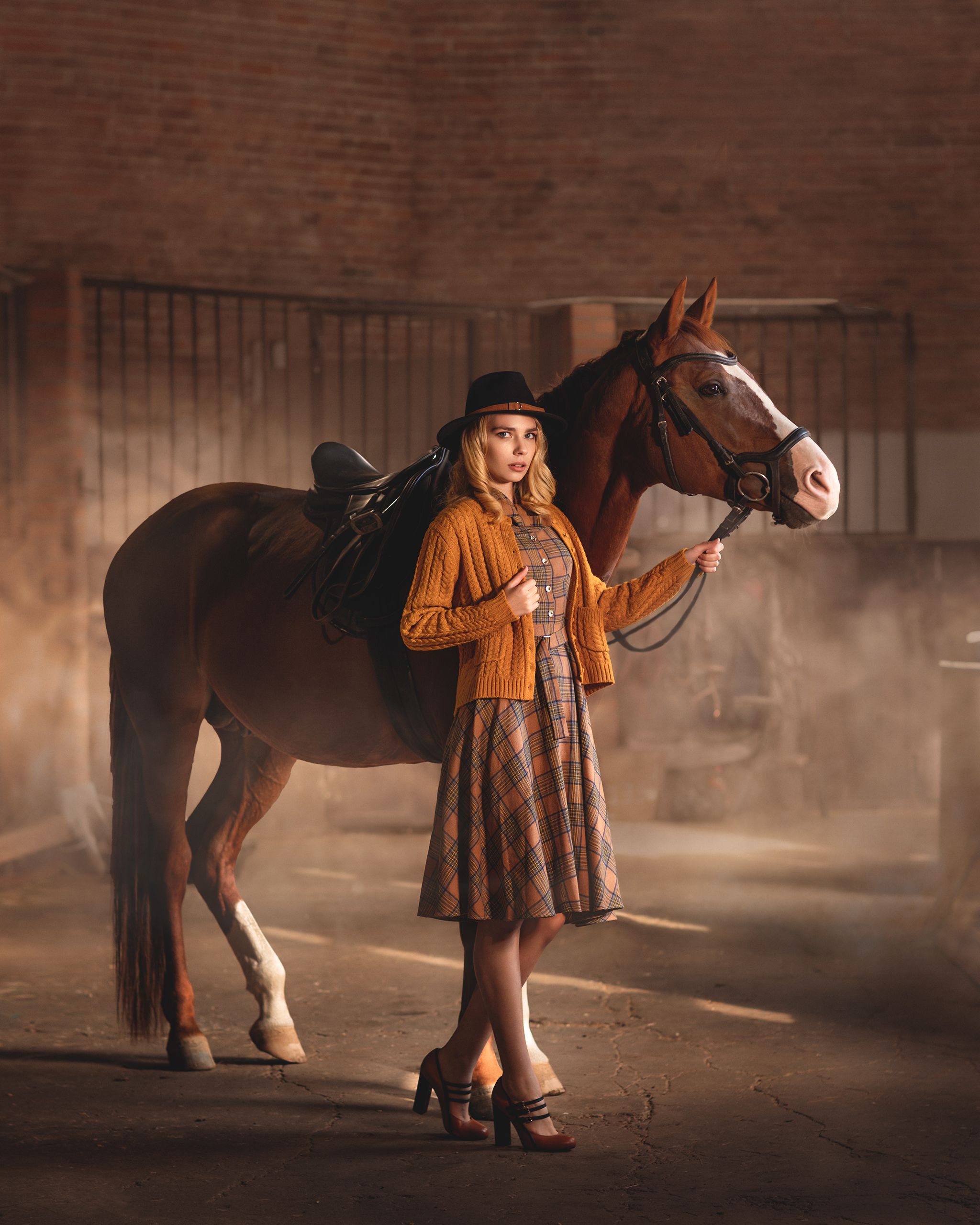 На снимке — молодая женщина в элегантной одежде, держащая поводья лошади в просторном стойле. Тёплый свет и пыльный воздух придают сцене уют и ностальгию. Фотография передаёт тёплые отношения между человеком и животным, подчёркивая спокойствие и уважение. Работа Михайловой Елены.
