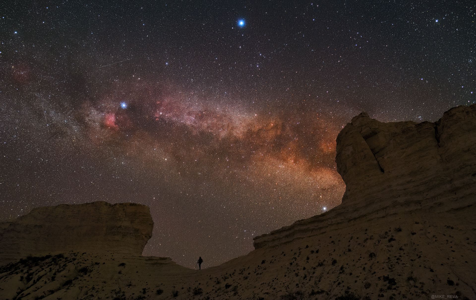 Над позирующим в кадре астрофотографом бросаются в глаза три самые яркие звезды созвездий Лиры, Лебедя и Орла - Вега, Денеб и Альтаир. Они формируют, один из самых легко узнаваемых в ночном небе астеризмов - летний треугольник.