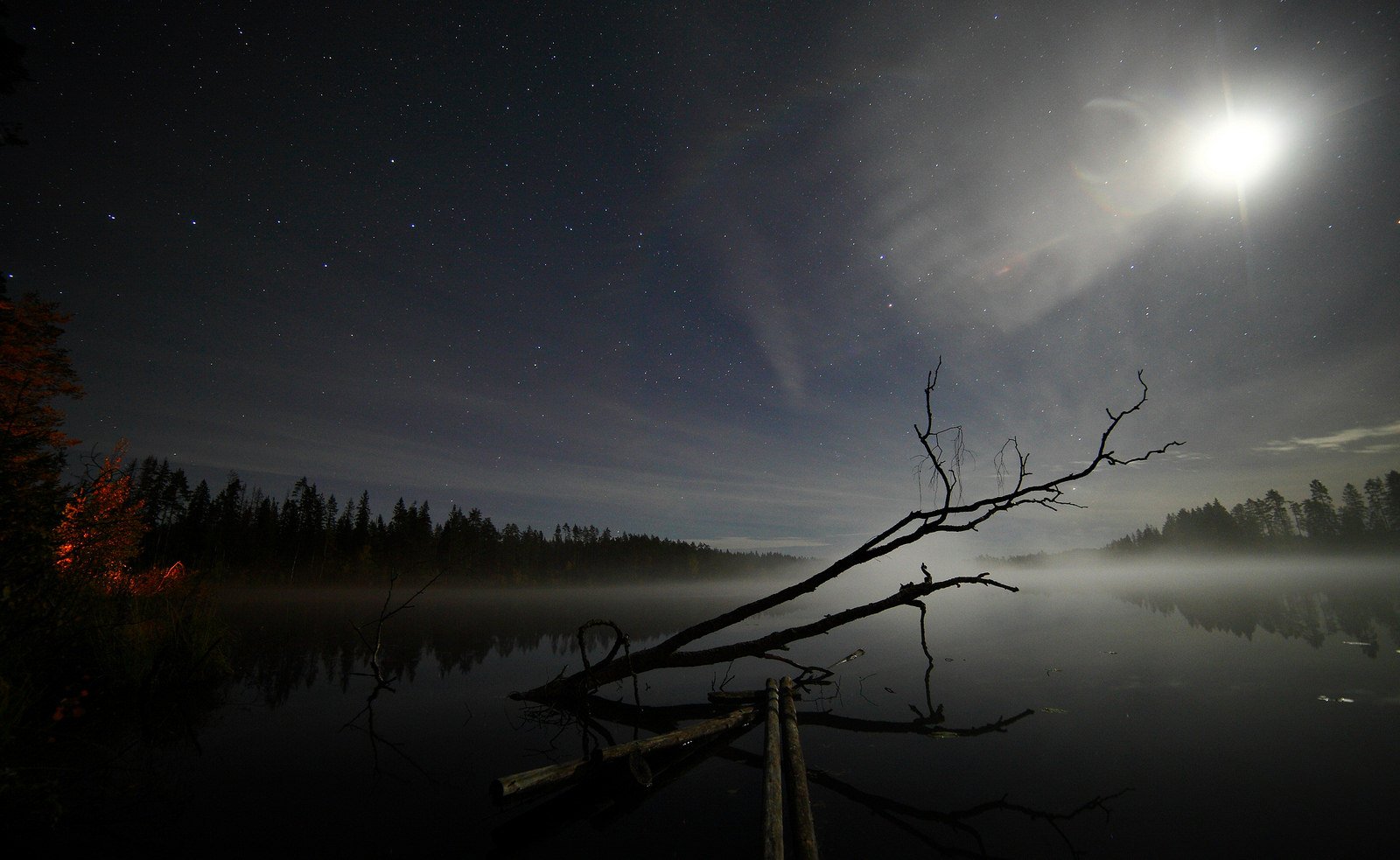Скорее всего та ночь была первой этой осенью когда столбик термометра опустился таки ниже нуля. Убывающая, но еще яркая Луна создавала мистическую атмосферу, освещая дымку над водной гладью .... удивительно было наблюдать как сильно изменилось столь знакомое место в этих обстоятельствах....