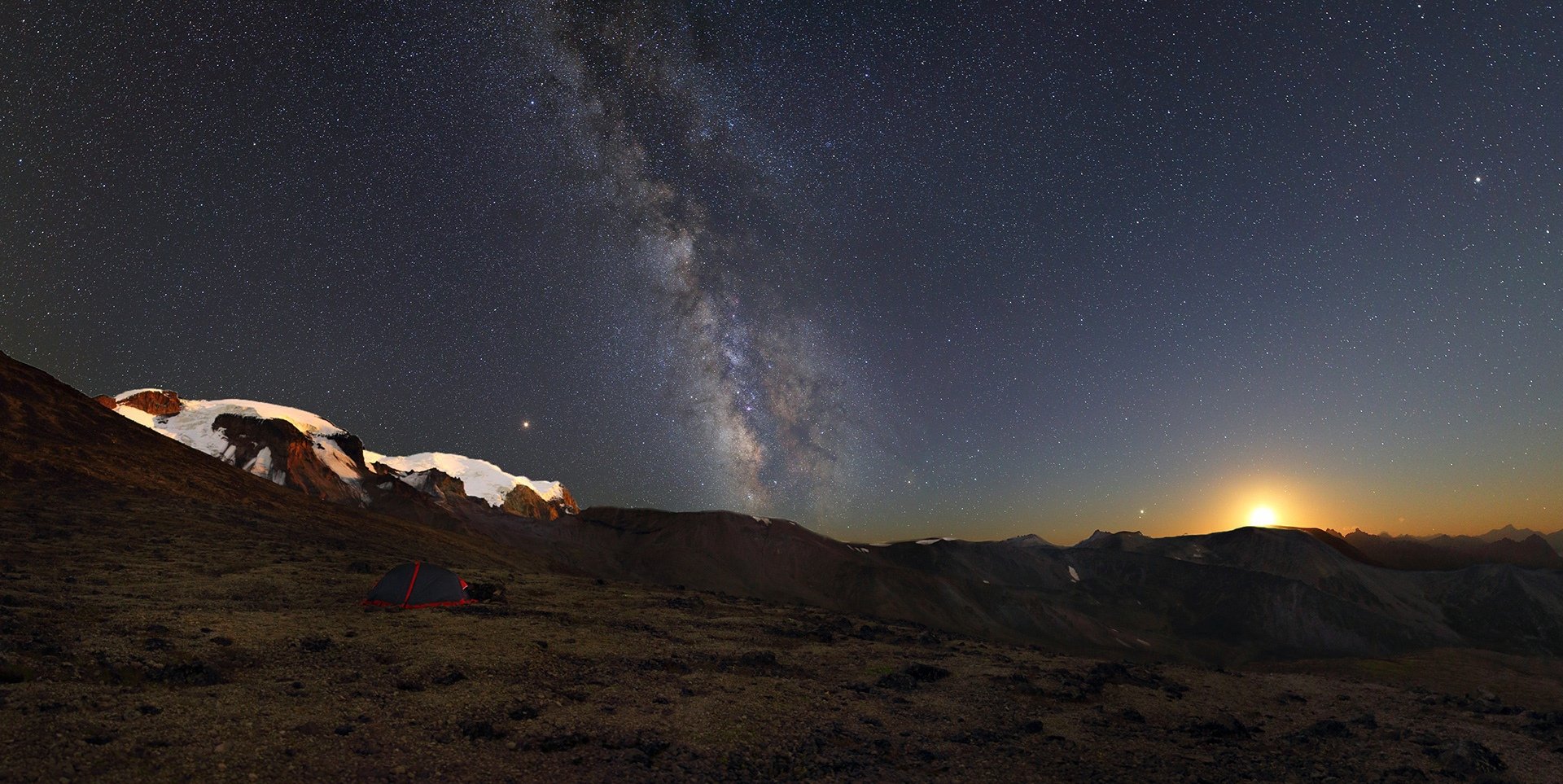Под конец ходового дня случилось неприятное - низкая облачность полностью скрыла склон, по которому мы собирались траверсом выйти на нужный нам перевал. Так как времени до темноты оставалось впритык, то пришлось выбирать место для палатки на продуваемом открытом месте. С час работы и мы растащили все крупные и средние камни в стороны, сложили из них ветрозащитную стенку и снова оказались в пятизвездочных условиях для ночлега. Небо в ту ночь снова было отличным, даже садящаяся Луна в фазе около 25% не могла помешать Млечному Пути быть отчетливо видимым.