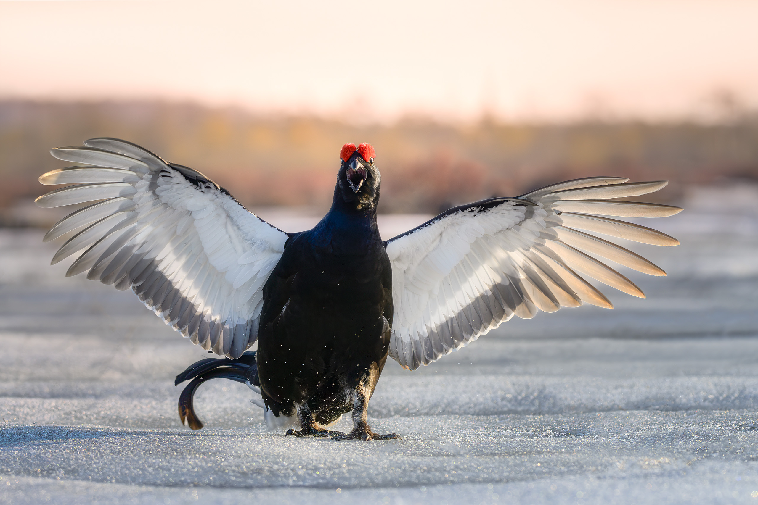 Михаил, снимок сильный — птица в полном токовом размахе, контраст чёрного оперения и белых крыльев выдержан чётко. Утро, лёгкий иней на земле — свет мягкий, но достаточно для деталей. Композиция центрирована, взгляд тетерева прямой, что усиливает динамику. Хорошо пойман момент.