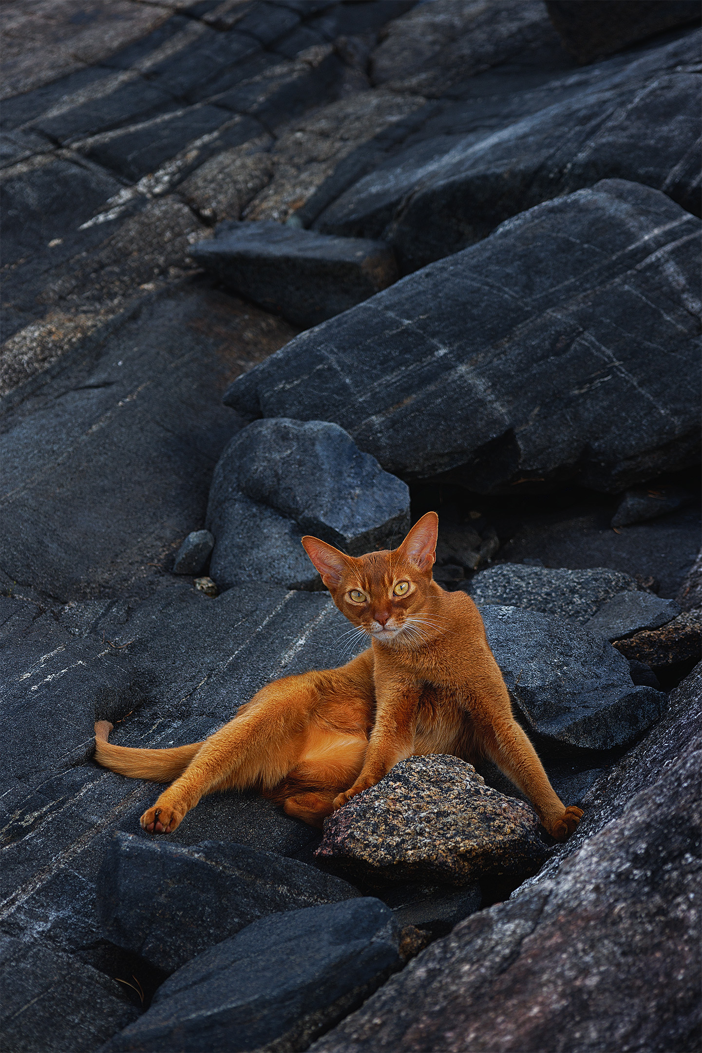 Ого, Елена, какая живая поза у кота! 🐱 Сразу видно, что он не позирует — просто сидит, как хозяин этих камней. Цвет шерсти на фоне тёмного камня — просто волшебно, будто огонёк в сером. Снимок дышит, чувствуешь, как он там — на ветру, в тишине. Классно, что удалось поймать этот момент.