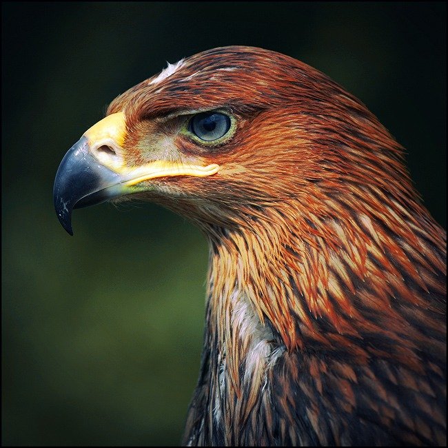 Тут почти агрессивная резкая обработка подчеркивает остроту зрения пернатого и мощь его клюва, но в то же время находится очень на грани отрицания серьезности настроя этого хищника - портрет почти праздничный, сочный, но хочется все же приглушить цвета. ИМХО.