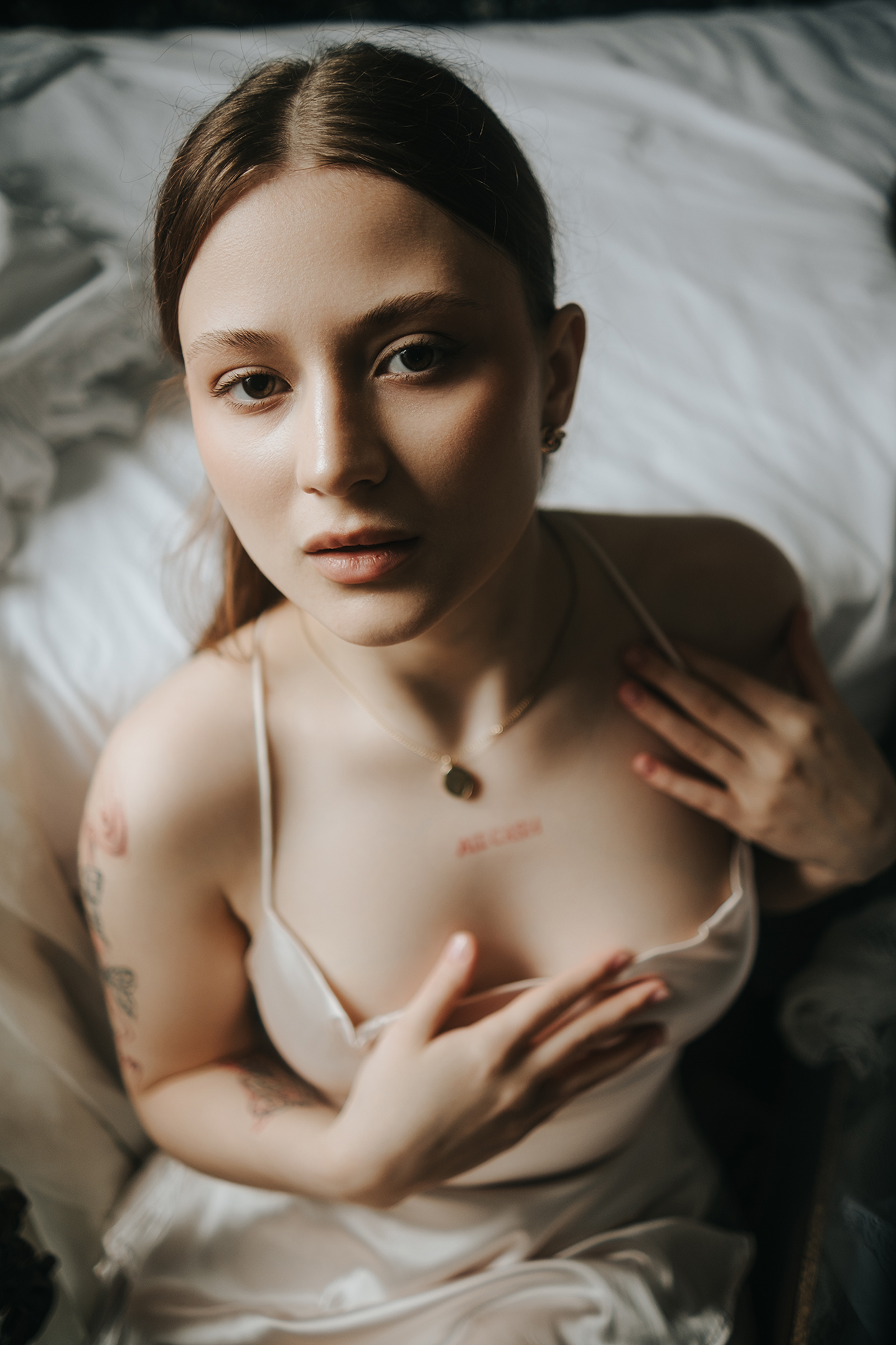Вы использовали мягкий свет и нейтральный фон, чтобы акцентировать внимание на выражении лица и деталях тела — это работает. Какой момент в позе или взгляде Вы хотели передать?