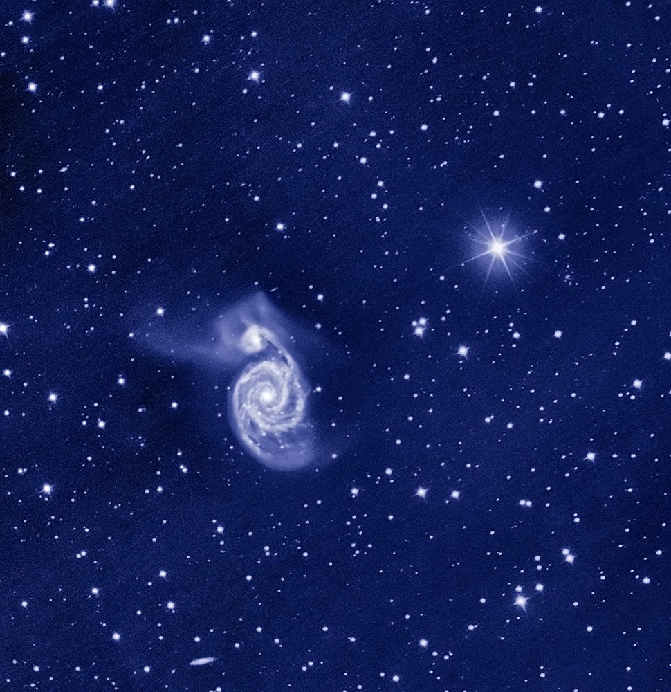 Знаменитая галактика М51 "Водоворот" в созвездии Гончих псов. Хорошо виден её спутник, а также ещё несколько более далёких галактик. На полном кадре их видно несколько десятков! Кроме этого видна межзвёздная пыль - это уже наша, нашей Галактики. :)