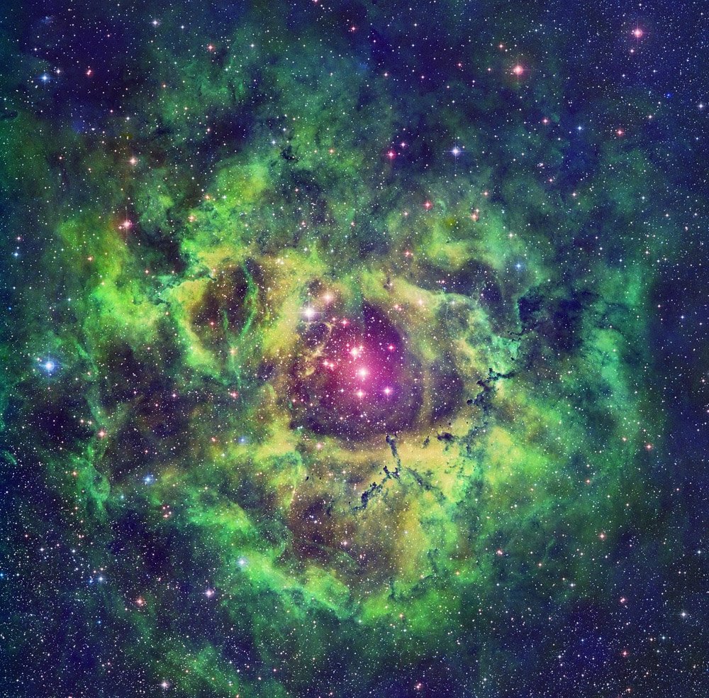 Туманность Розетка в созвездии Единорога. Хорошо видна осенью и зимой. На фотографиях, сделанных с помощью узкополосных фильтров, приобретает причудливые цвета и структуру.