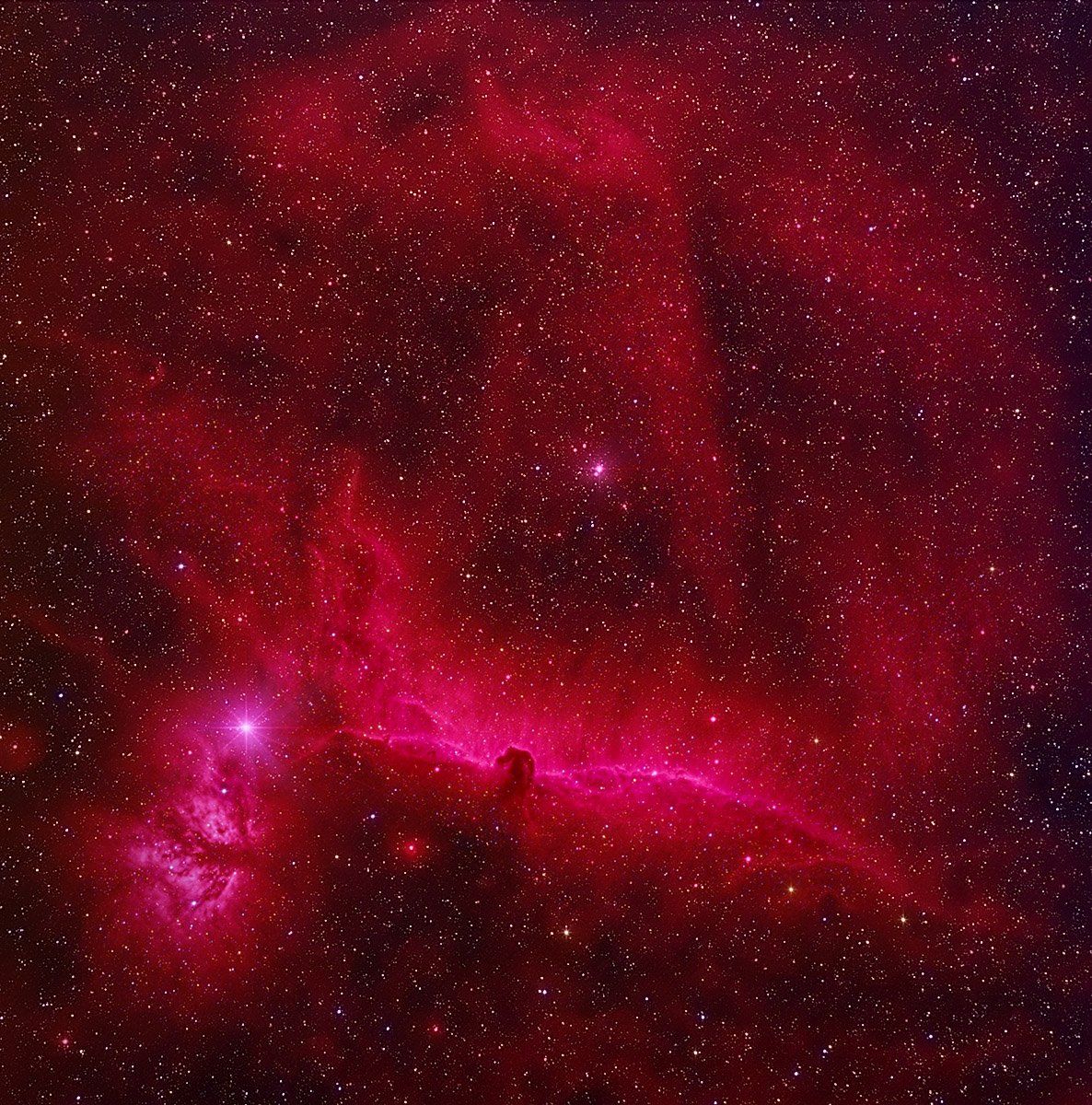 Комплекс водородных и пылевых туманностей в созвездии Ориона. Вообще, это созвездие - одна сплошная туманность; их там масса. Тёмная пылевая туманность ниже центра кадра носит название Конская Голова.