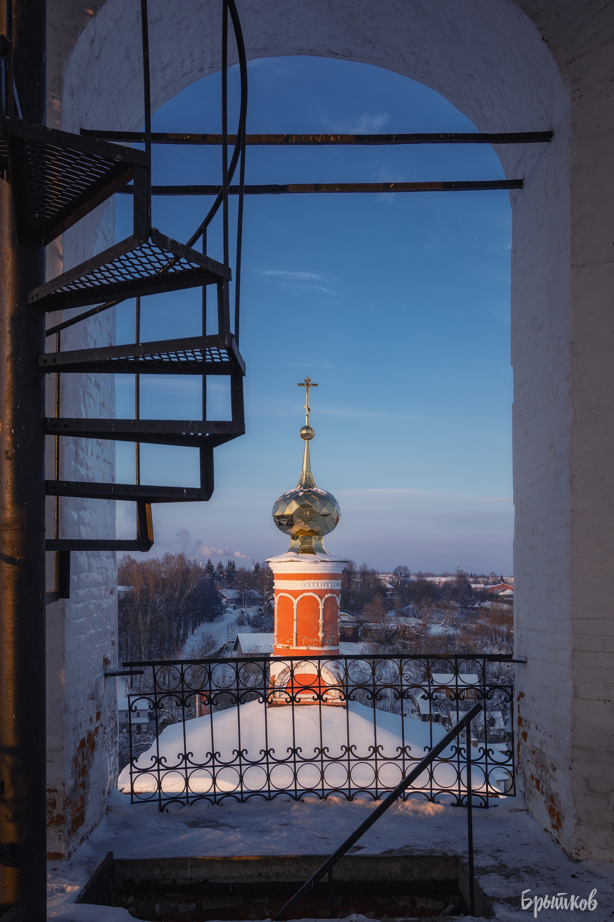 Вы сняли монастырь в зимнем свете — хорошо получилось. Вид из арки, с высоты, на закате — спокойно, чётко, с чувством места. Снег, золотые купола, тени — всё в меру. Неплохо.