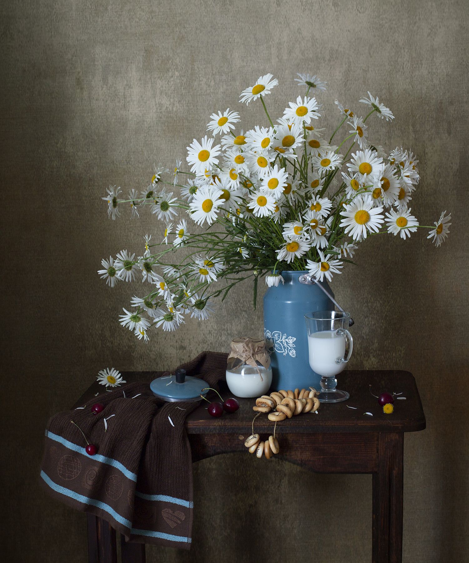 миламиронова, фотонатюрморт, авторскаяработа, натюрмортсцветами, натюрмортсоснедью, ромашки, цветы, молоко, сушки, бидон, Миронова Мила