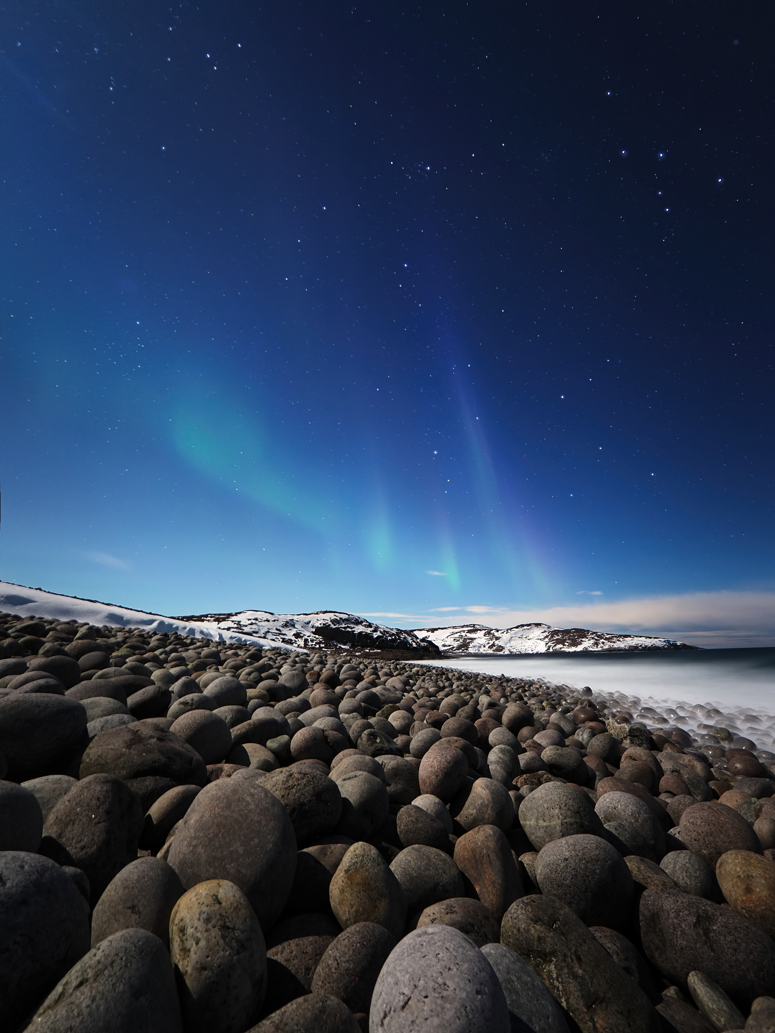 Получилось неплохо — северное сияние на фоне звёздного неба и каменистого берега выглядит впечатляюще. Мягко, но заметно, можно было бы чуть сильнее подчеркнуть контраст между светом сияния и тёмными камнями, но как есть — уже очень хорошо.