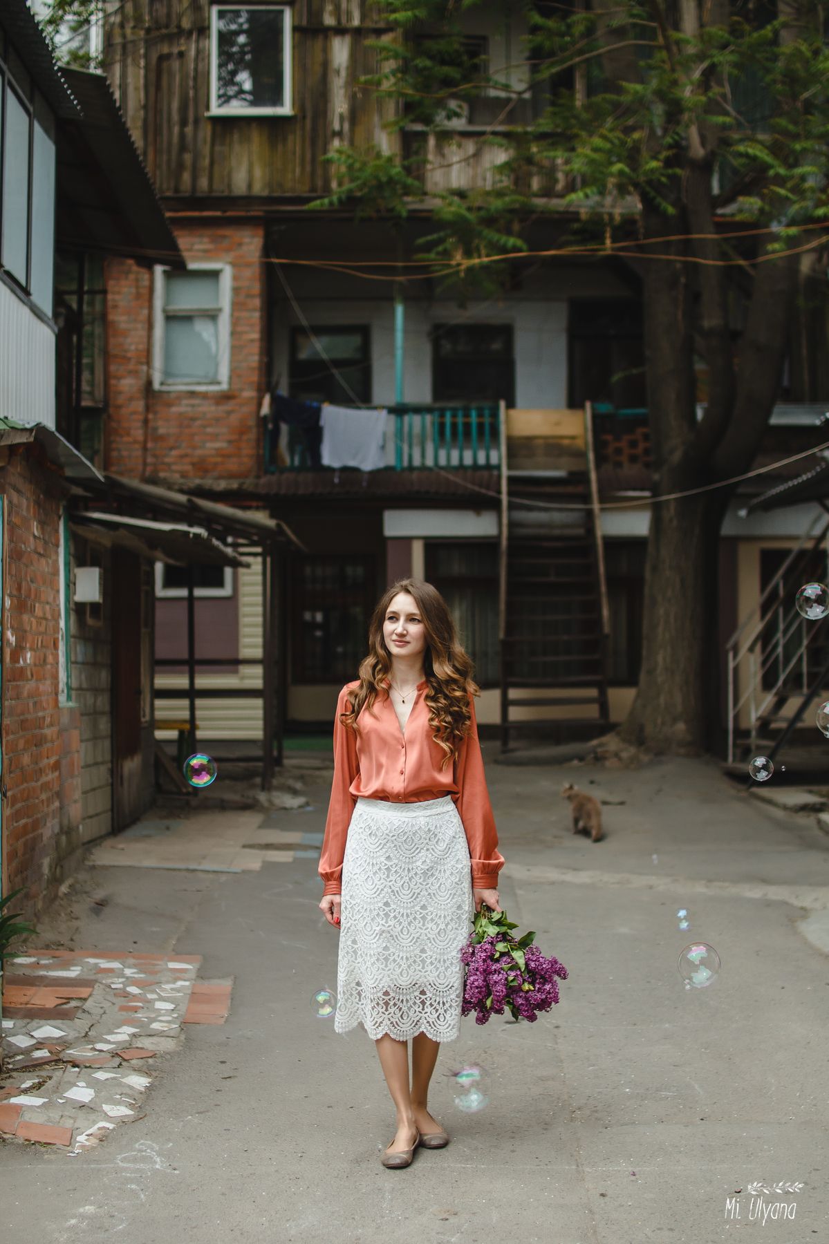 Тёплым майским днём мы гуляли с Леной по улочкам старого Ростова, и нам приглянулся один колоритный дворик) Решили сделать там пару кадров. Во дворе было двое ребятишек, игравших и пускавших мыльные пузыри. Видите эти пузыри на фото?) Те самые ребятки вызвались поучаствовать в нашей съёмке и пускали пузыри прямо нам в кадр