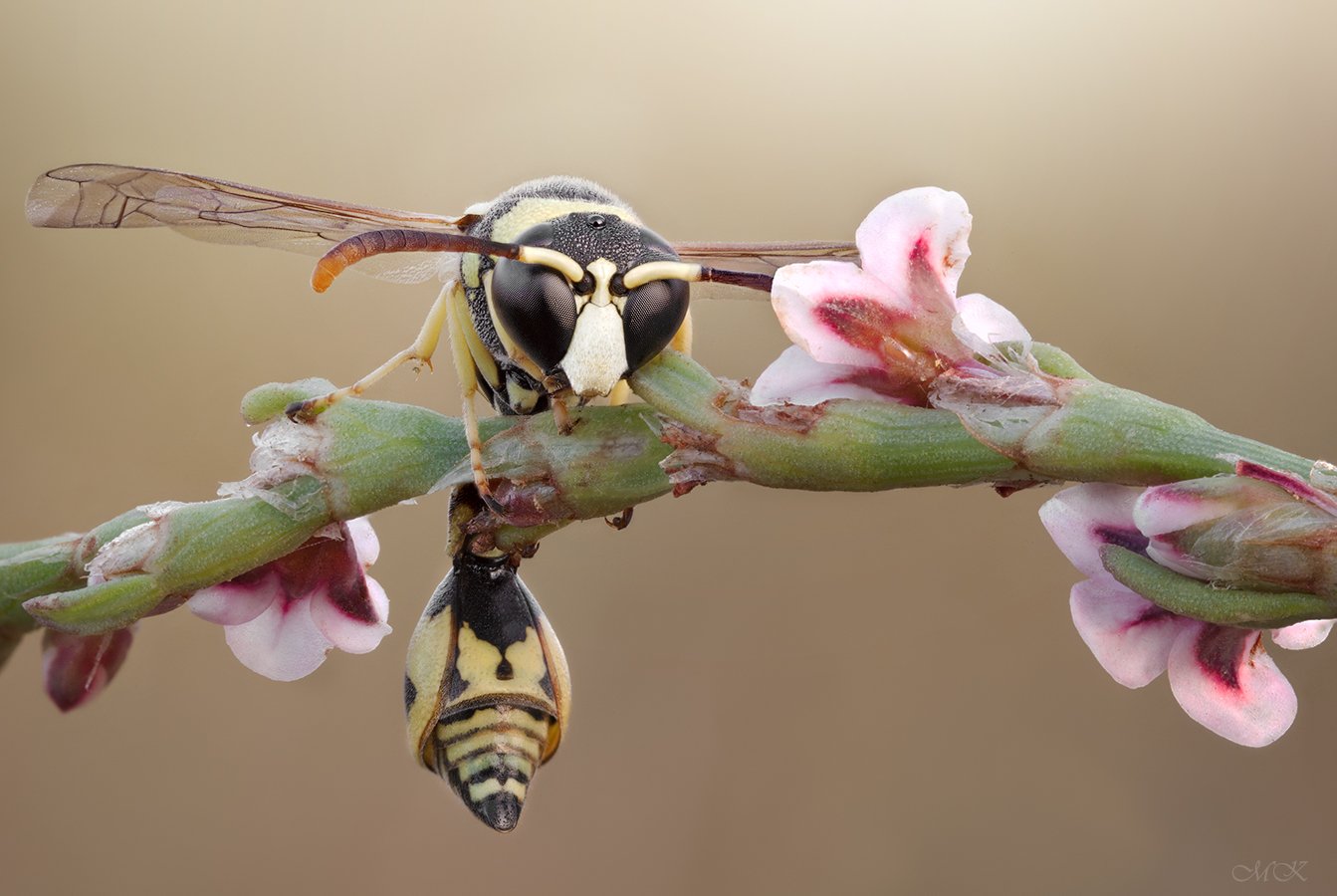 Здесь 60 кадров:-). Это снято вчера ранним утром в поле.Первый кадр 6:18, последний 6:22. В это время (близкое к восходу солнца) насекомые обычно малоактивны, поэтому иногда удается сделать серию, а иногда не удается. Кстати, эти осы и во сне постоянно шевелят усиками и брюшком, поэтому даже , если они и не улетают, не все так просто:-).