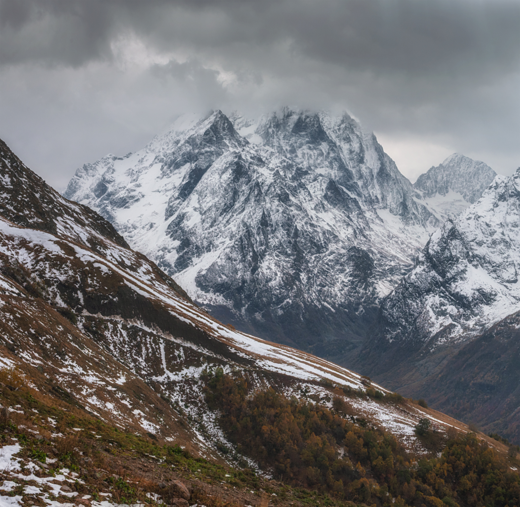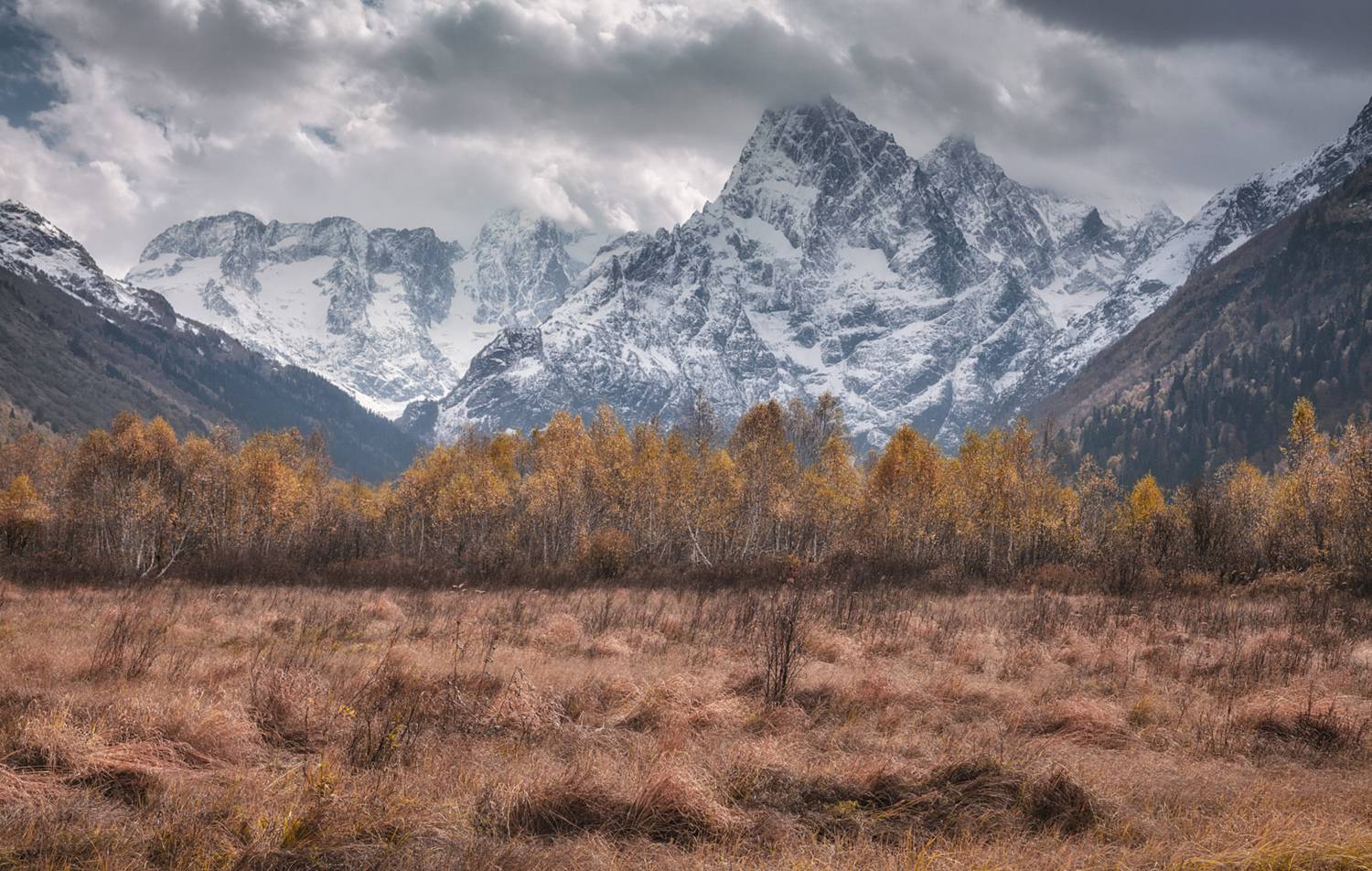 Николай, снимки передают атмосферу переходного сезона в горах Западного Кавказа — снег на вершинах, осенние оттенки в долинах, тяжёлые облака над пиками. Хорошо видно, как меняется ландшафт: от открытых склонов к лесам, затем к широким полянам. Композиция в каждой фотографии уравновешена, фокус на масштабе и деталях рельефа. Домбай-Ульген, Бу-Ульген, Чотча — все отражены с достоверностью. Работа продуманная, с уважением к месту.