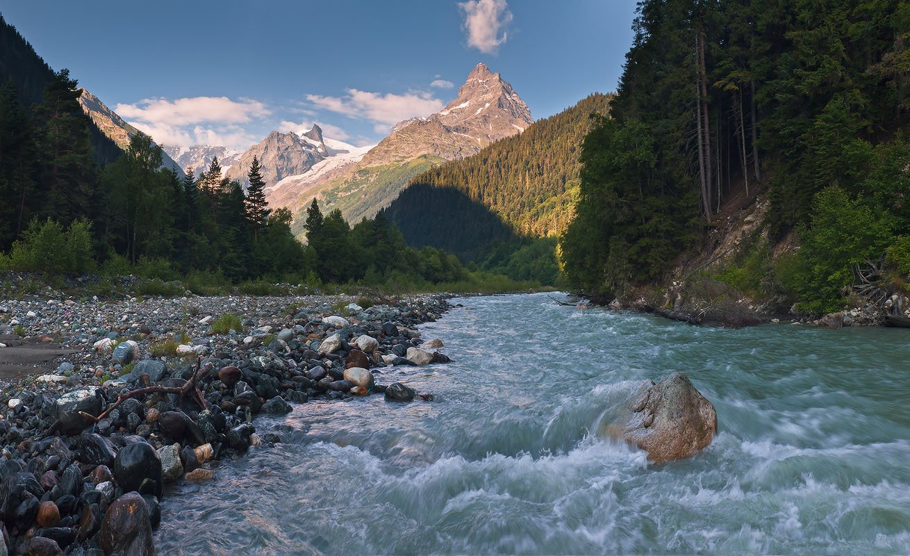 Белалакая (3861 м.) - едва ли не самая красивая вершина района,господствующая над Домбайской поляной - Белалакая (Полосатая скала), обязанная своим названием нескольким поясам из белого кварца, толщиной до 50 метров, прорезающими скальные стены.
