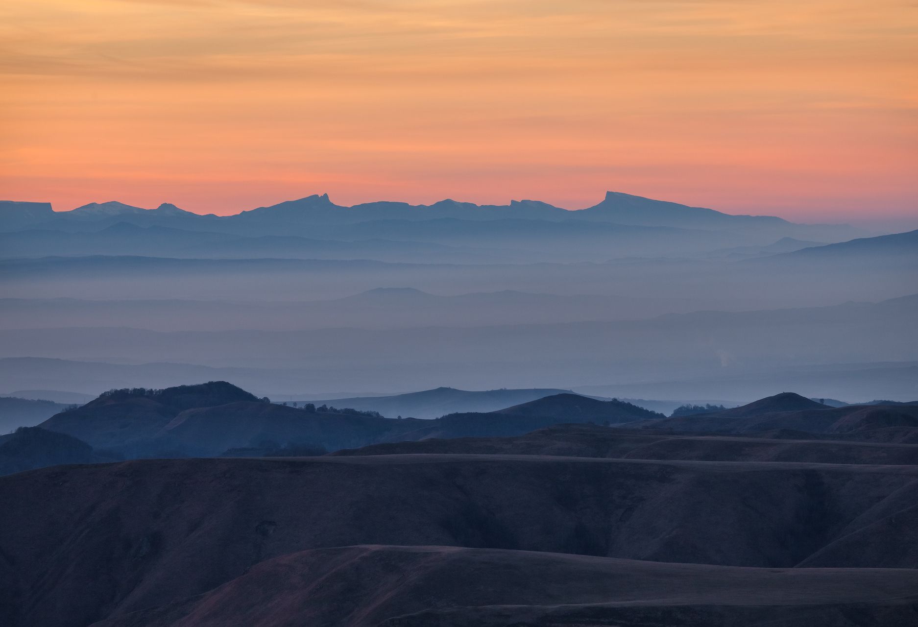 Вид на Передовой хребет с вершинами Большой и малый Тхач, Асбестная, Ачешбок на ЗП, 144 км. по прямой