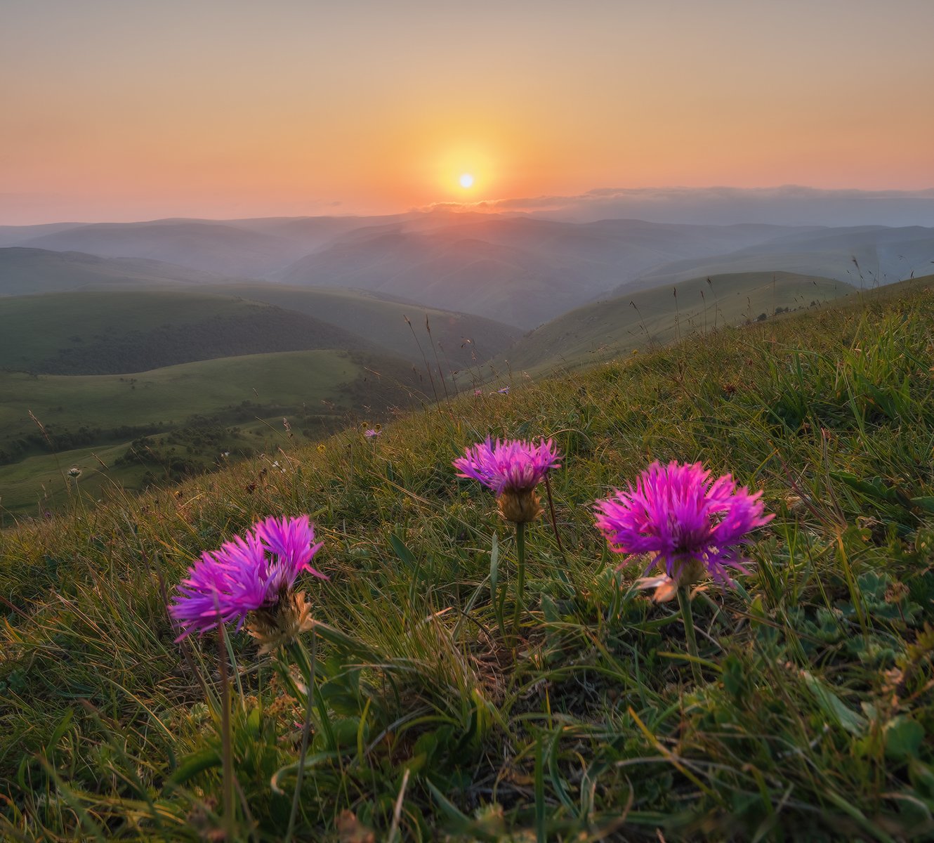 не чертополох точно, но думаю что семейство тоже из астровых. цветок крупный до 5 сантиметров в диаметре. длинные лепестки по периметру в сердцевине нет.