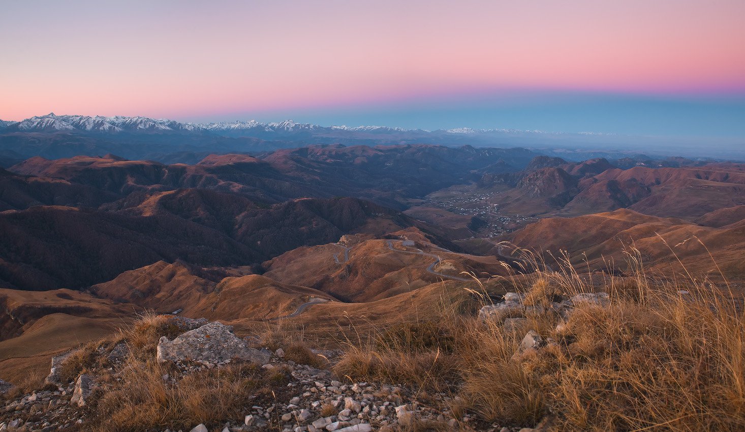снималось с одной из горок Скалистого хребта с высоты около 2000 м, сам аул на высоте 1600-1800 м. внизу виден серпантин дороги А 157 Карачаевск - Кисловодск и обзорная площадка для туристов. слева за кадром остался Эльбрус