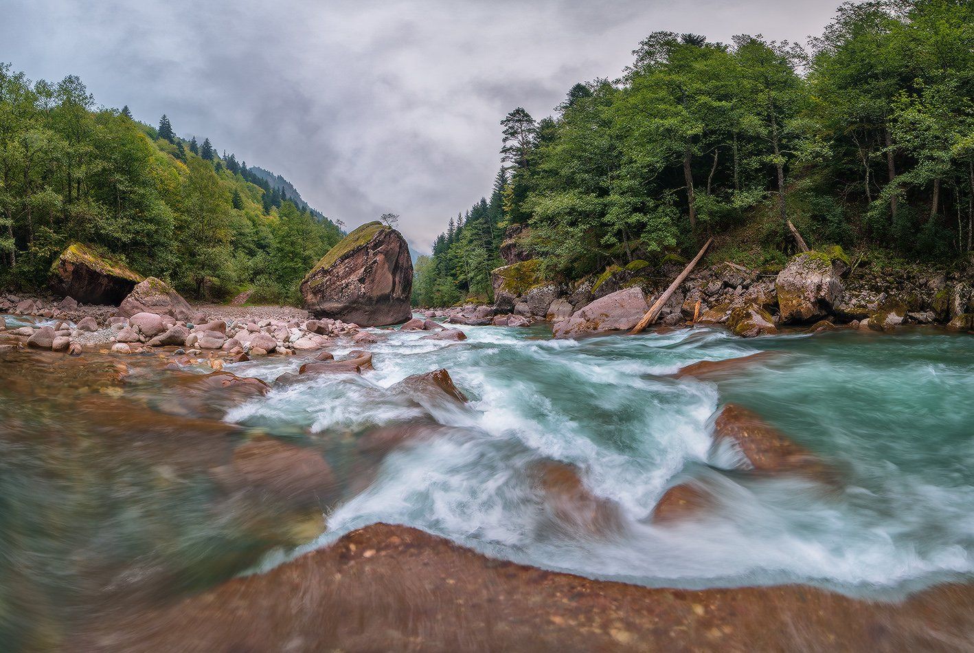 Я из Пхии 7-го спускался на УАЗе-грузовичке в дождь, но вода была изумрудная, несмотря на два дня предыдущих поливов. Просил водителя остановиться там-сям, чтобы сделать пару кадров. Жаль, что не пешком шёл - лёгкий туман, рассеянный свет и изумруд воды были просто прелесть...