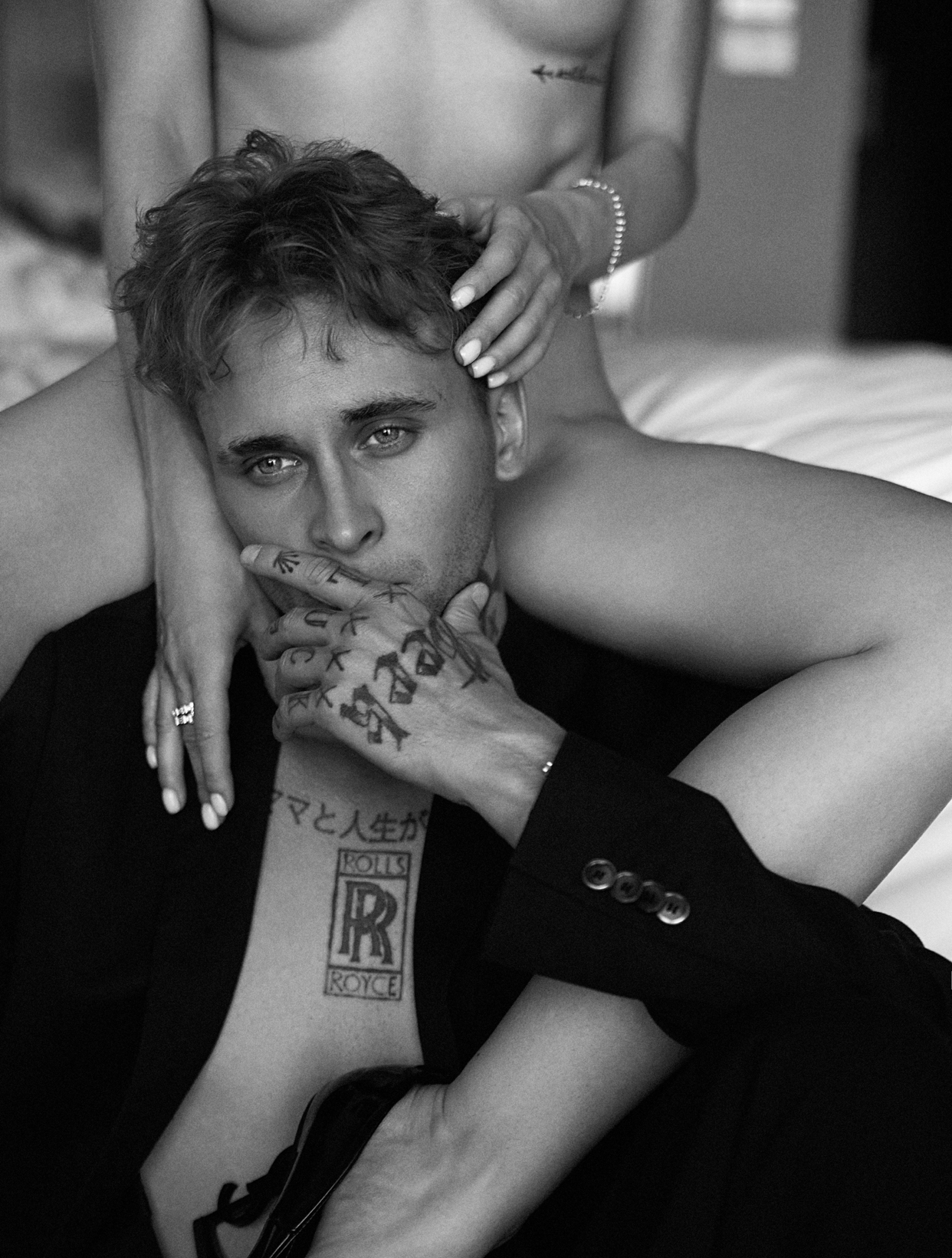 Снимок живой — глаза парня в кадре цепляют, татуировки на руках и шее добавляют истории, а поза с девушкой создаёт ощущение близости, но не перебора. Чёрно-белый формат тут точно в тему — убирает лишнее, оставляет суть.