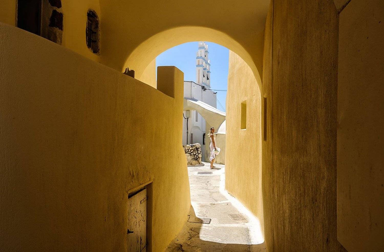 Когда путешествовали этим летом по о. Санторини, оказались в местечке (городок или деревушка?) под названием Эмпорио. Город сразу поразил своей необыкновенной архитектурой, буквально ослепил белизной своих улиц в полуденном солнце. Местo не очень популярное среди туристов, так как находится не рядом с морем. Но - рай для фотографов! Фактура, линии, цвет, старина! Хотелось прочувствовать его основательно. Не знаю, кем был придуман этот стиль города, но выглядит это невероятно. Это несколько похоже на то, что мы видели в Ие и Фире (куда обычно завозят всех туристов с экскурсионными группами), но воспринимается совершенно иначе. Прямые линии и углы очень гармонично сочетаются с плавными формами. И белый. Кругом белый цвет! Ну и, конечно, синий. А еще желтый. :) А как же без желтого - это же цвет солнца :) Кажется, что улочки не подчиняются никакой структуре. Иногда они такие узкие, что сложно разминуться... И трудно понять, замысел в этом какой-то, удобство или просто для того, чтобы смотрелось круто:) Хотя выглядит действительно круто!