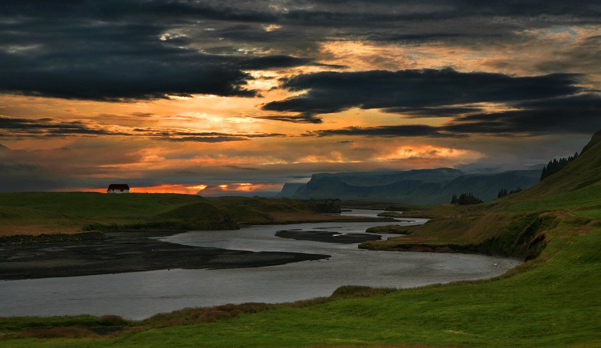 Диагональка зигзагообразная реки и небо,очень! Домик,лично мне не мешает!