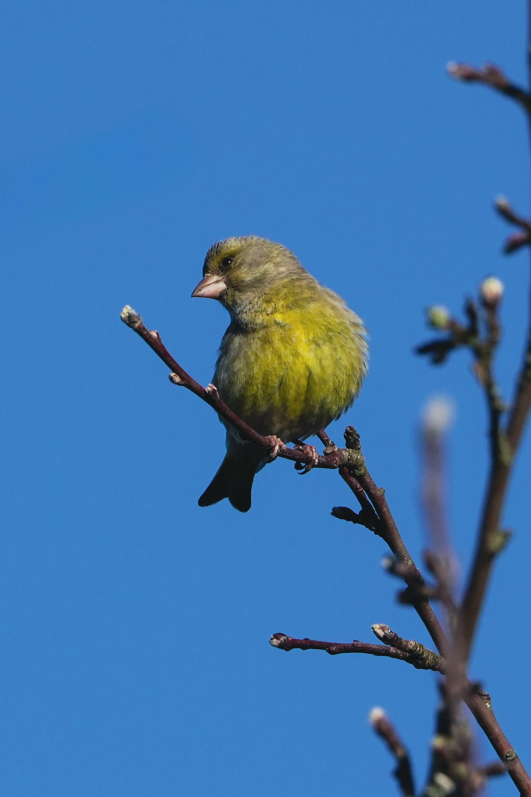 На снимке запечатлена маленькая зелёная птица — вероятно, самец зеленой птицы (зеленушки), сидящая на тонкой ветке. Яркое синее небо служит идеальным фоном, подчёркивая её живые цвета и естественную красоту. Птица выглядит спокойной, возможно, отдыхает или наблюдает за окружением. Снимок передаёт атмосферу ранней весны: ветви ещё без листьев, но уже пробуждаются почки. Это типичный кадр для любителей орнитологии и природной фотографии — простой, но выразительный момент из жизни дикой природы.