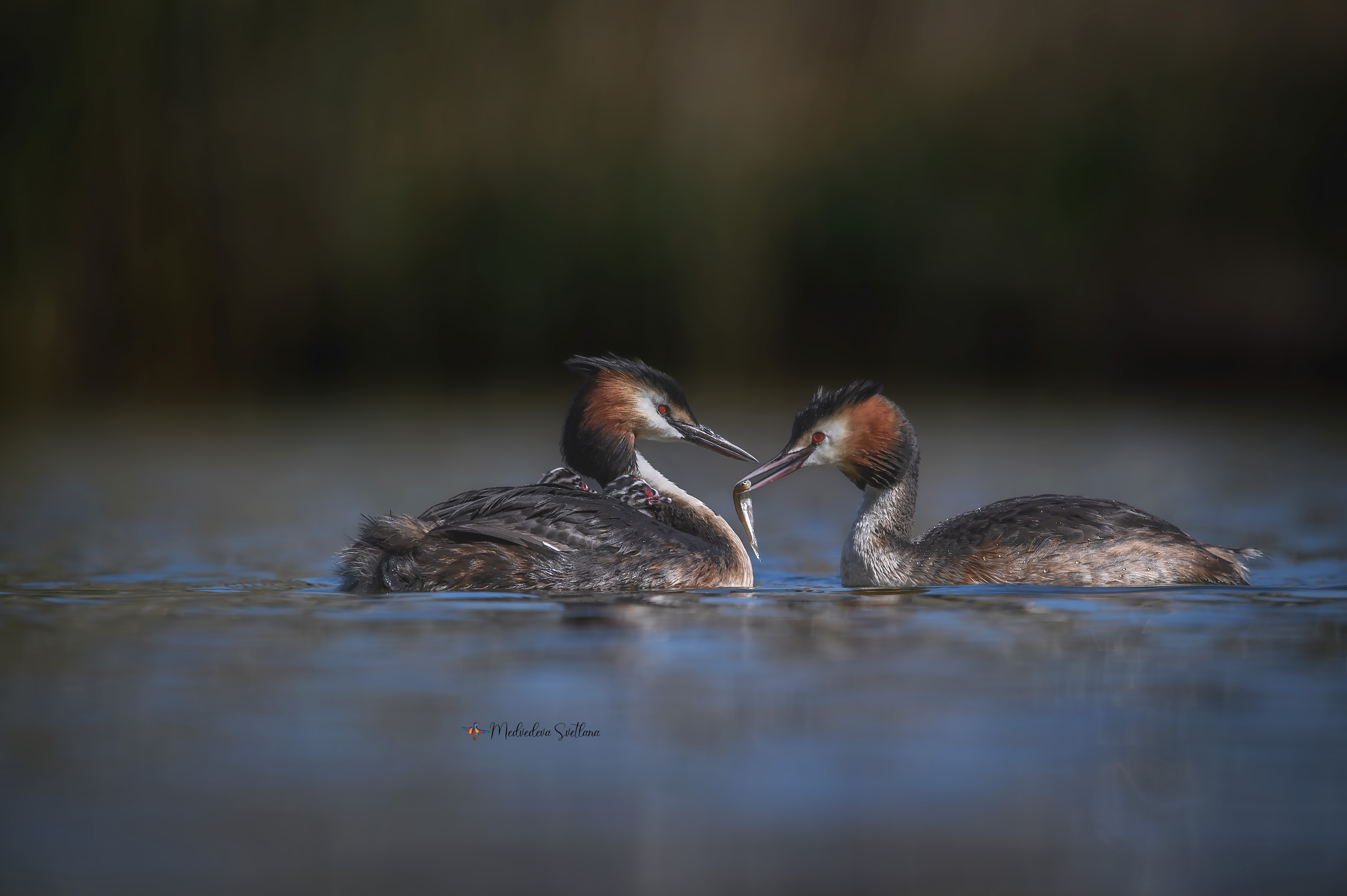 Фото очень живое — видно, как чомги заботятся о птенцах. Атмосфера тёплая, даже через экран чувствуется близость семьи.