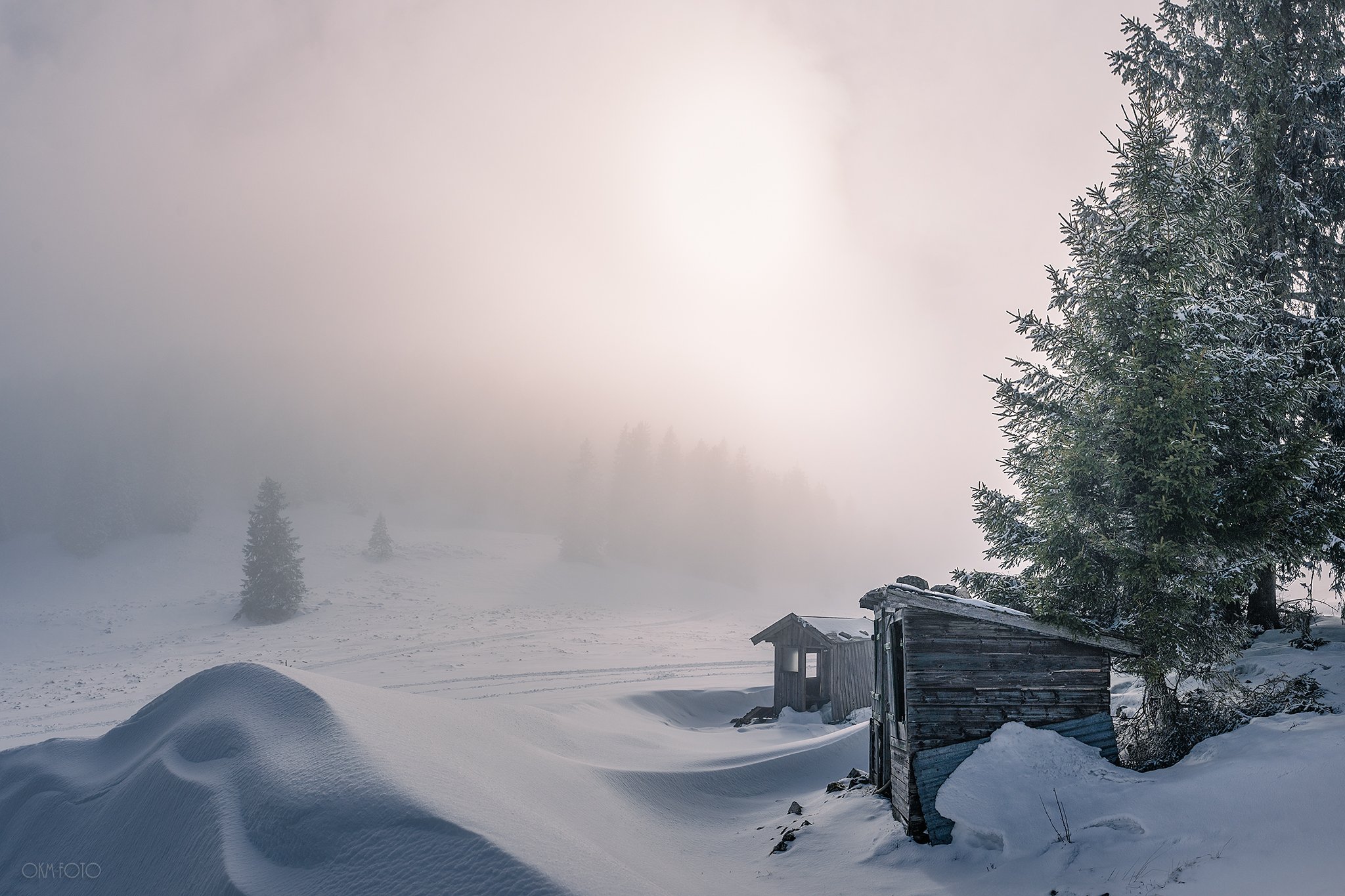 В Баварских Альпах выше 1500 метров сейчас много снега, а на отдельных открытых местах надувает солидные сугробы. Так называемый Hochnebel (в переводе высокий туман, который ближе к вечеру накрывает склоны почти до 1700 метров) подсвечивается солнцем и создаёт сказочную атмосферу... )