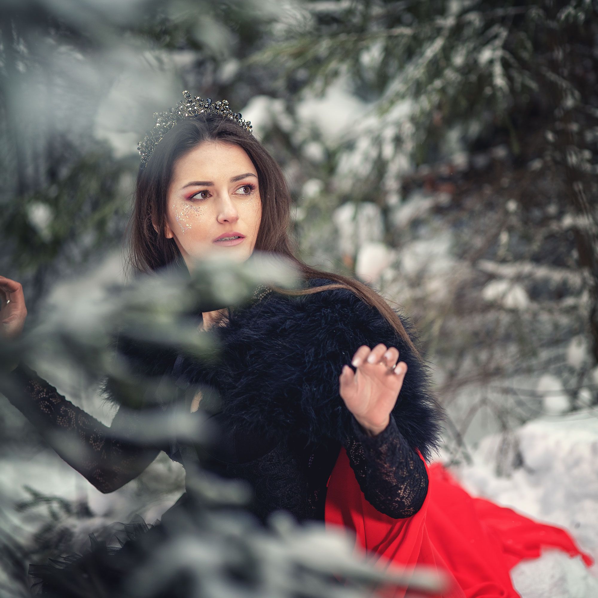 девушка в лесу зимний лес снег красное на снегу сказка арт корона принцесса , Ирина Мухина