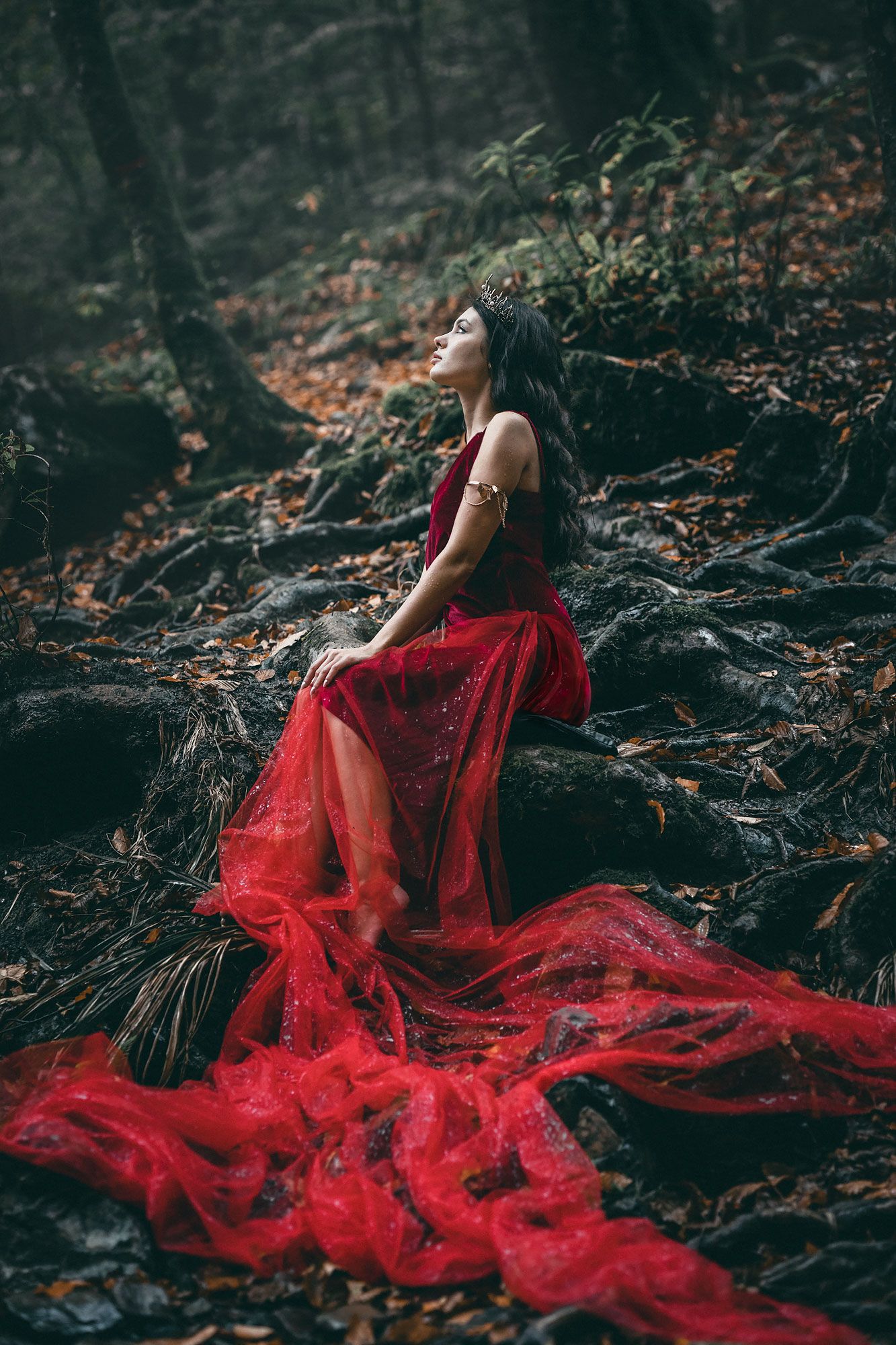 темноволосая девушка осень красное дождь лес корни сказочная, Ирина Мухина