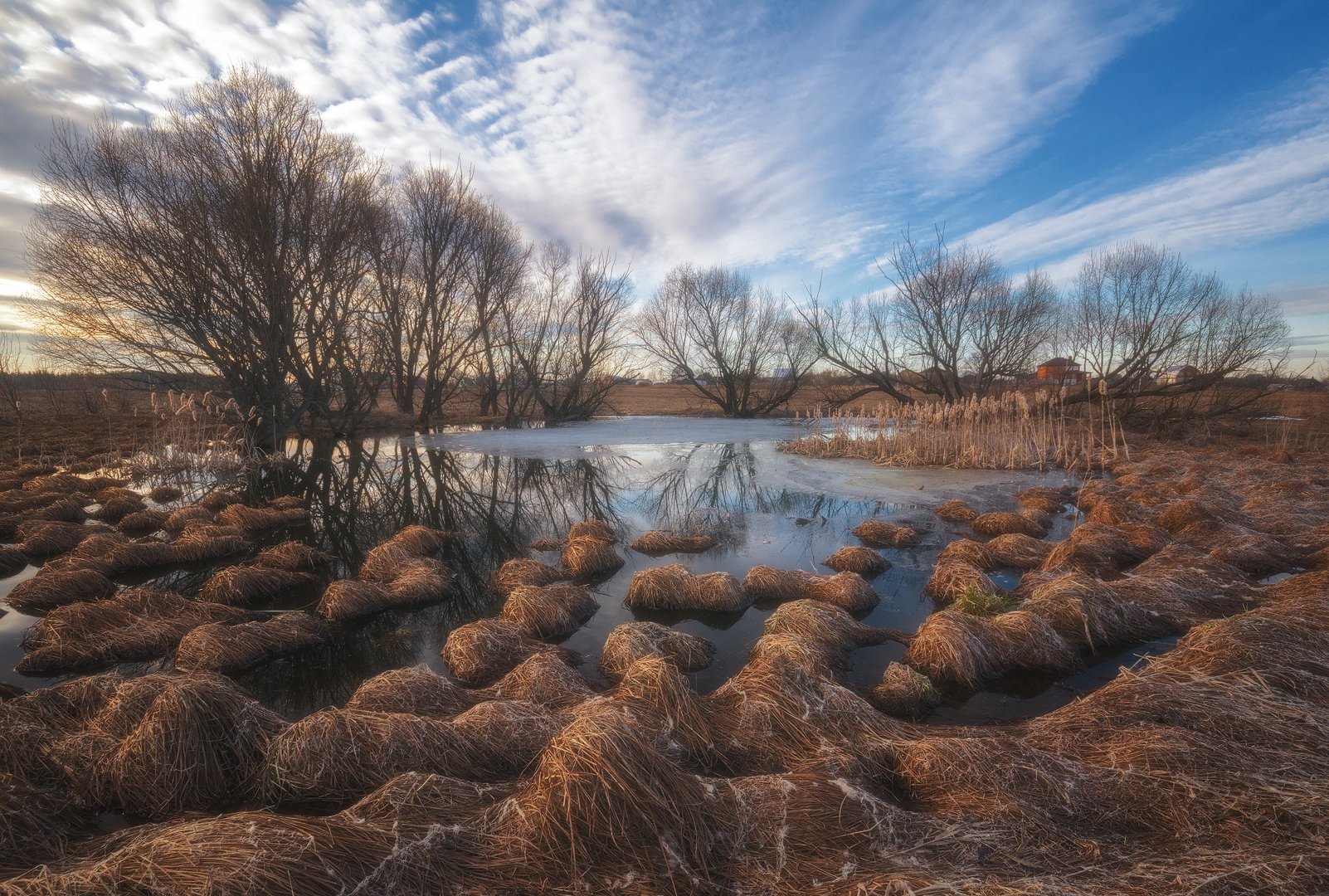россия, подмосковье, весна, пруд, кочки, трава, вода, небо, облака, Иван Мухин