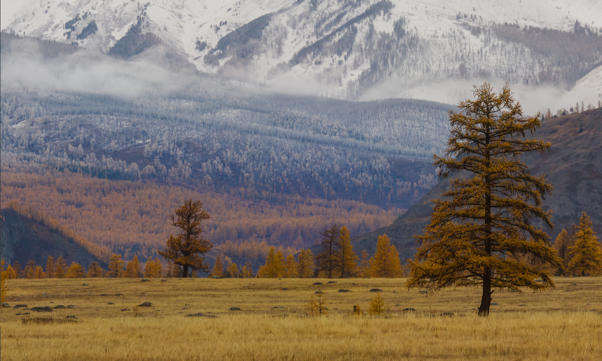 Осень в горах — удачно поймали момент: слои тумана, золото лиственниц, снежные пики на фоне. Композиция выстроена чётко, цвета работают друг на друга. Хорошая работа.