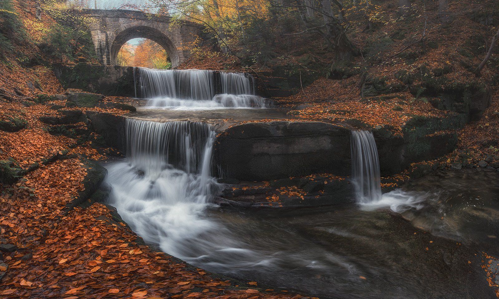 На снимке — живописный осенний пейзаж с каскадным ручьём, текущим по каменистому руслу, усыпанному ярко-оранжевыми и красными листьями. Вдали виден старинный каменный мост, а вода, смягчённая длинной выдержкой, создаёт эффект шёлкового потока. Фотография передаёт тишину и умиротворение природы в золотой поре года. Работа Красимира Матарова.