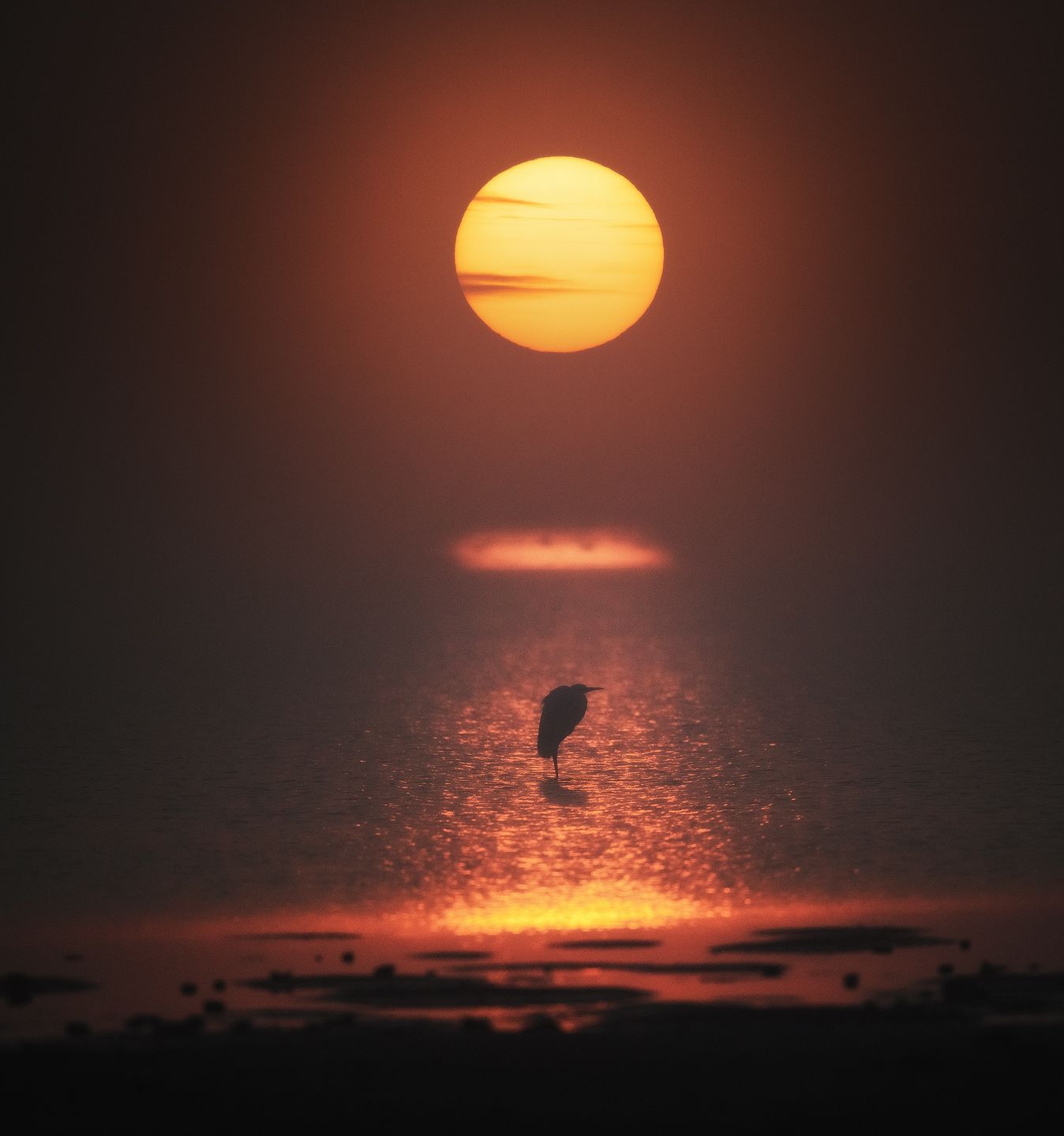 На горизонте — яркое солнце, погружающееся в морскую гладь, окрашивая небо и воду в насыщенные оранжевые и красные тона. В центре кадра — одинокая птица, чей силуэт выделяется на фоне светящегося отражения. Сцена передаёт ощущение умиротворения и гармонии с природой. Фотография Красимира Матарова захватывает мгновение, когда день уступает место ночи, оставляя после себя тишину и свет.