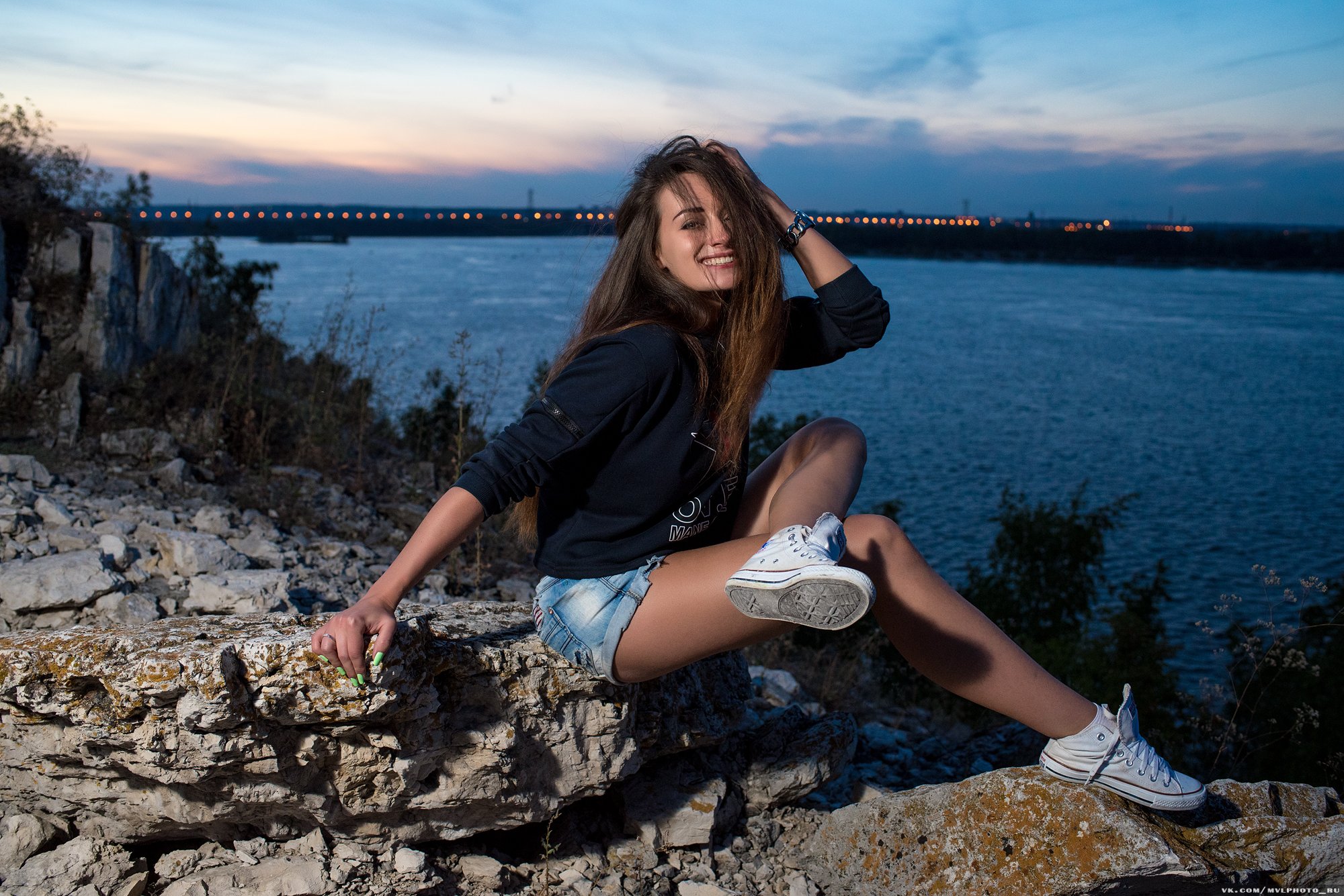 природа, горы, вода, река, огни, девушка, волосы, режимное время, улыбка, шорты, Вадим Миронов