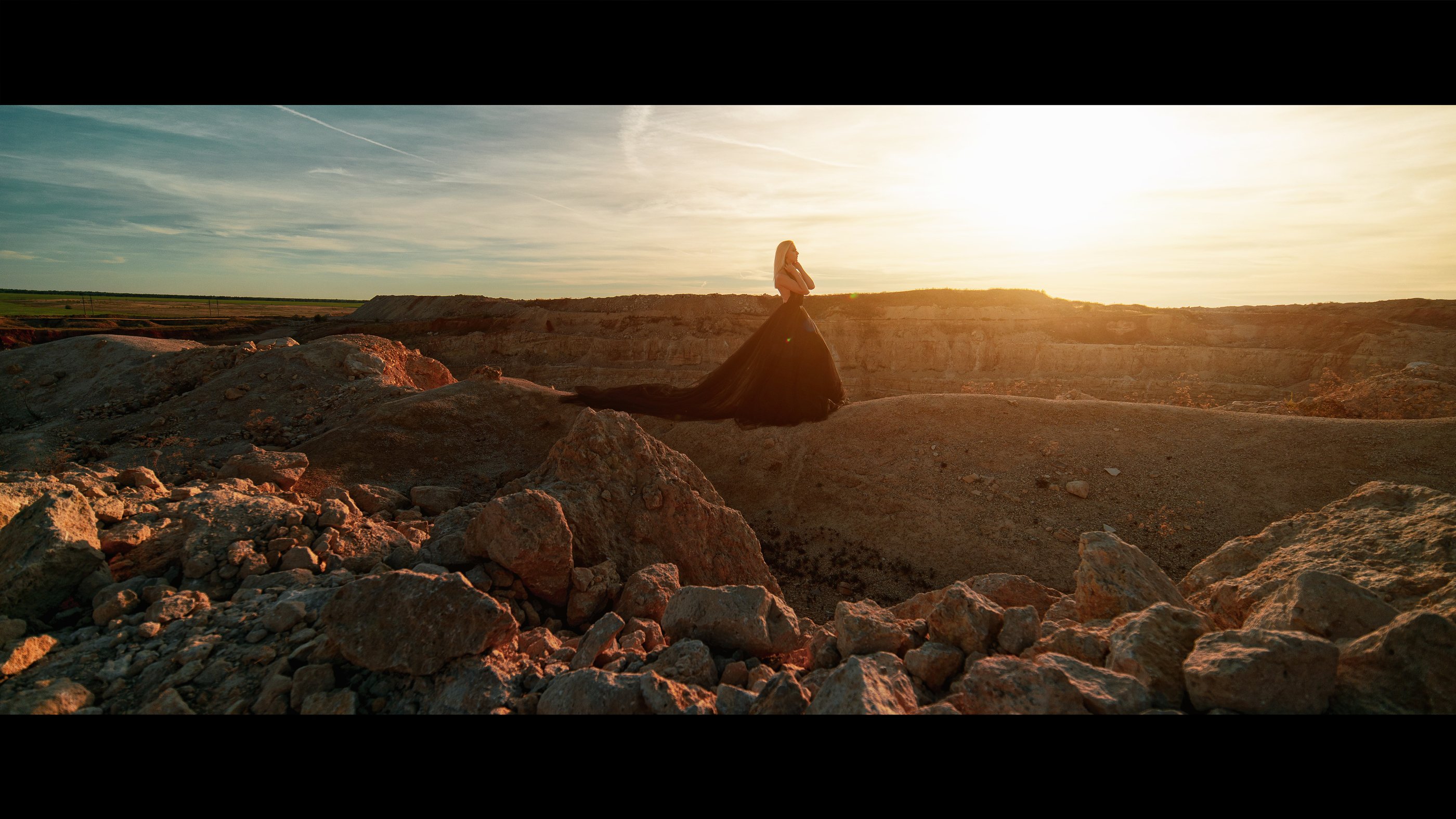 карьер, девушка, черное платье, закат, солнечный свет, широкий угол, Вадим Миронов