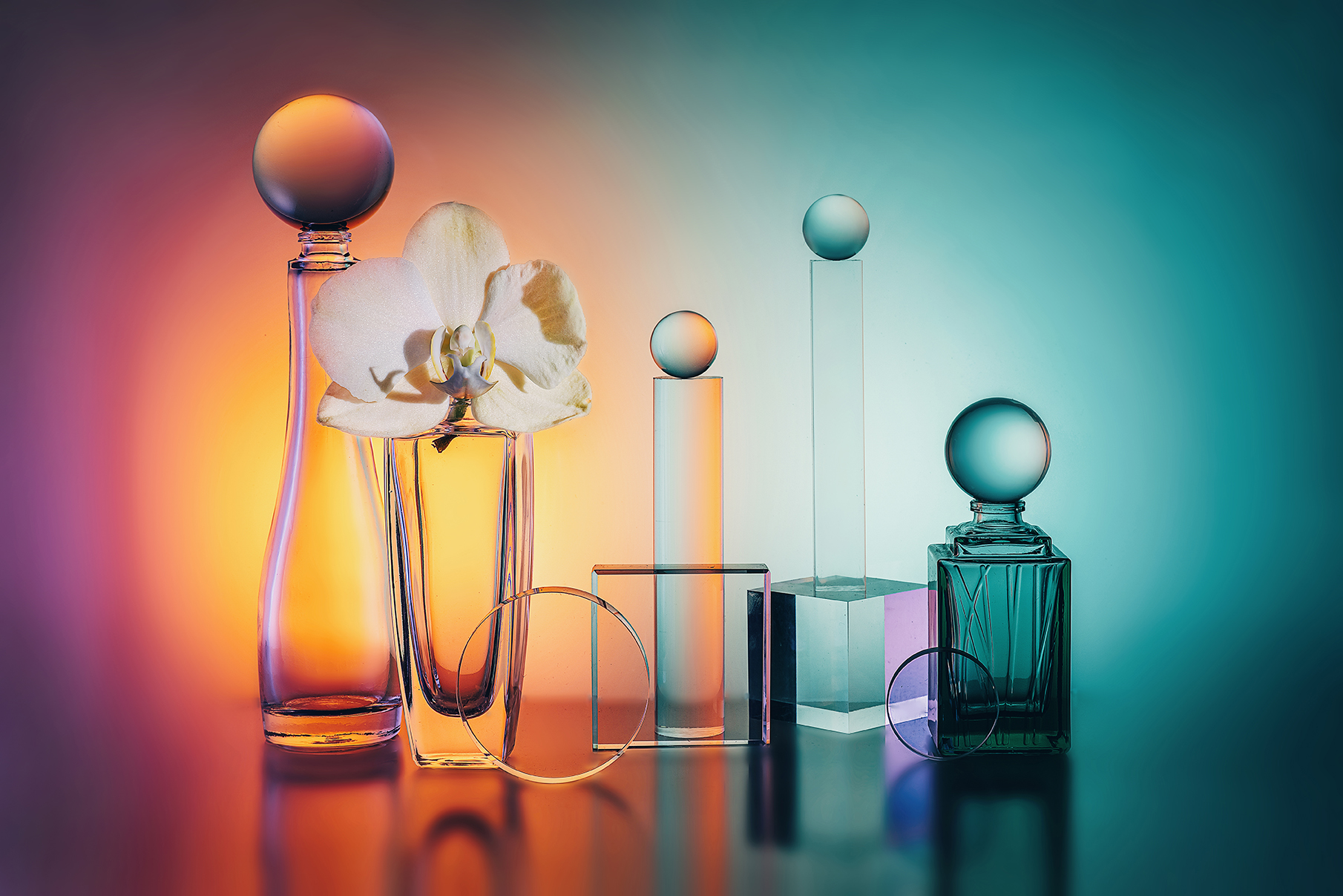 Фотография MVO демонстрирует точный контроль света и цвета — градиент от оранжевого к бирюзовому подчёркивает геометрию флаконов и прозрачность стекла. Композиция выстроена с упором на баланс форм и отражений, что придаёт снимку современный и лаконичный характер.