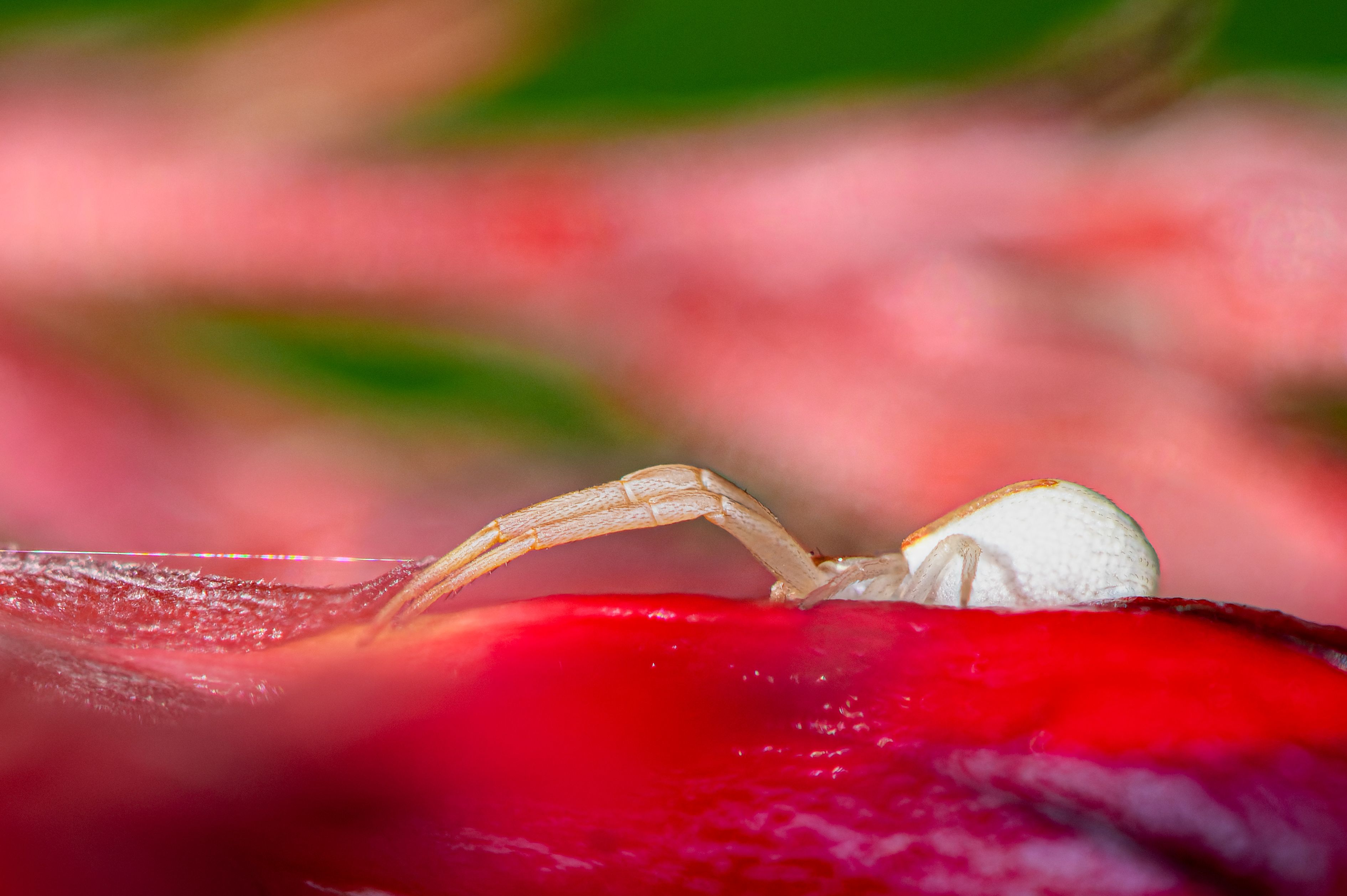 Misumena vatia is a species of crab spider with a holarctic distribution. In North America, it is called the goldenrod crab spider or flower (crab) spider, as it is commonly found hunting in goldenrod sprays and milkweed plants. They are called crab spiders because of their unique ability to walk sideways as well as forwards and backwards. Both males and females of this species progress through several molts before reaching their adult sizes, though females must molt more to reach their larger size. Females can grow up to 10 mm (0.39 in) while males are quite small, reaching 5 mm (0.20 in) at most. Misumena vatia are usually yellow or white or a pattern of these two colours. They may also present with pale green or pink instead of yellow, again, in a pattern with white. They have the ability to change between these colors based on their surroundings with these color changes occur through the molting process. They have a complex visual system, with eight eyes, that they rely on for prey capture and for their color-changing abilities. Sometimes, if Misumena vatia consume colored prey, the spider itself will take on that color.