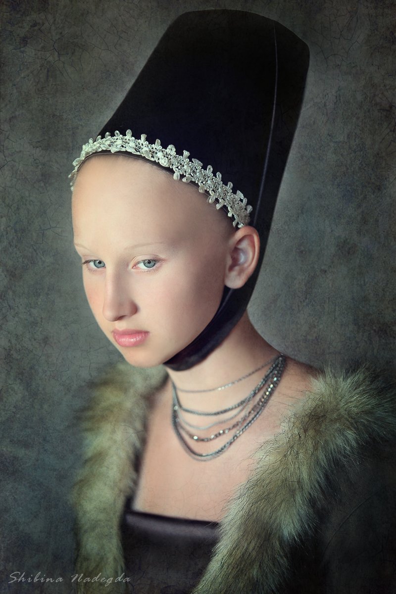 впечатляет... здесь как бы почти полное попадание в "лица" тех врмеен (подбритый лоб по моде, тонкие, слегка неясные черты лица, невидимые брови и ресницы) и одновременно современная внутренняя сила, которую автор и модель не скрывают...
