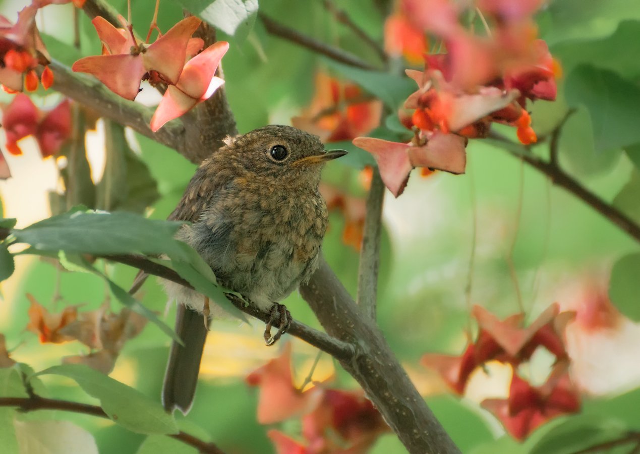 птица, зарянка, птенец, бересклет, Олег Тыркин