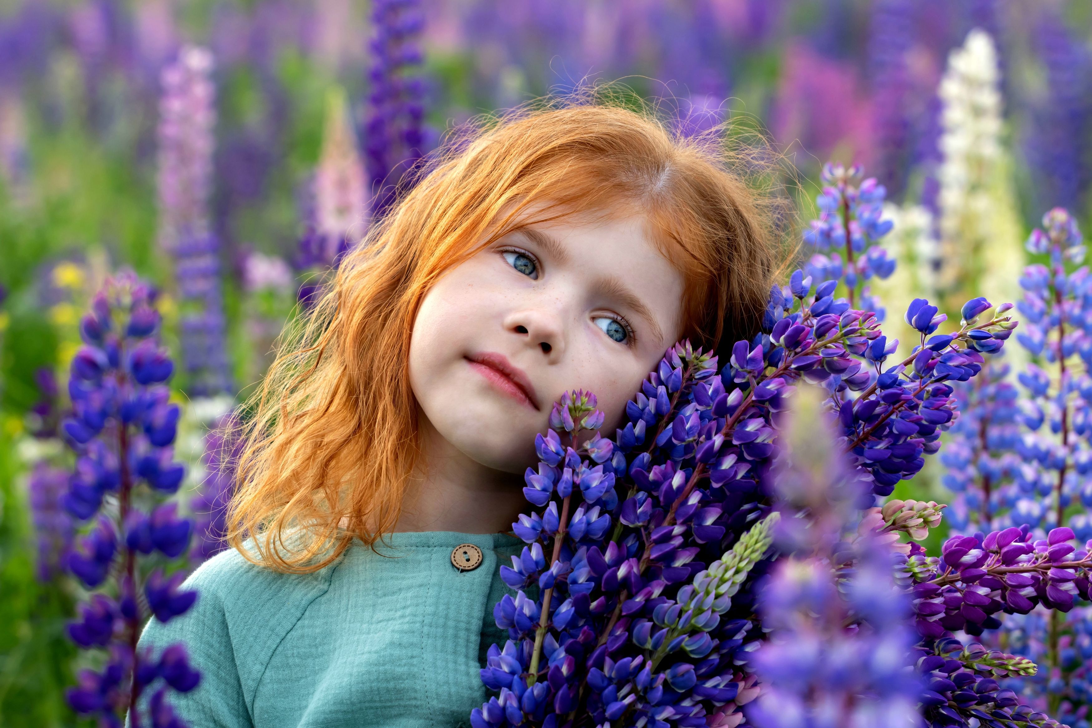 девочка, рыжие волосы, веснушки, люпины, цветы, поле, лето, Наталья Герцен