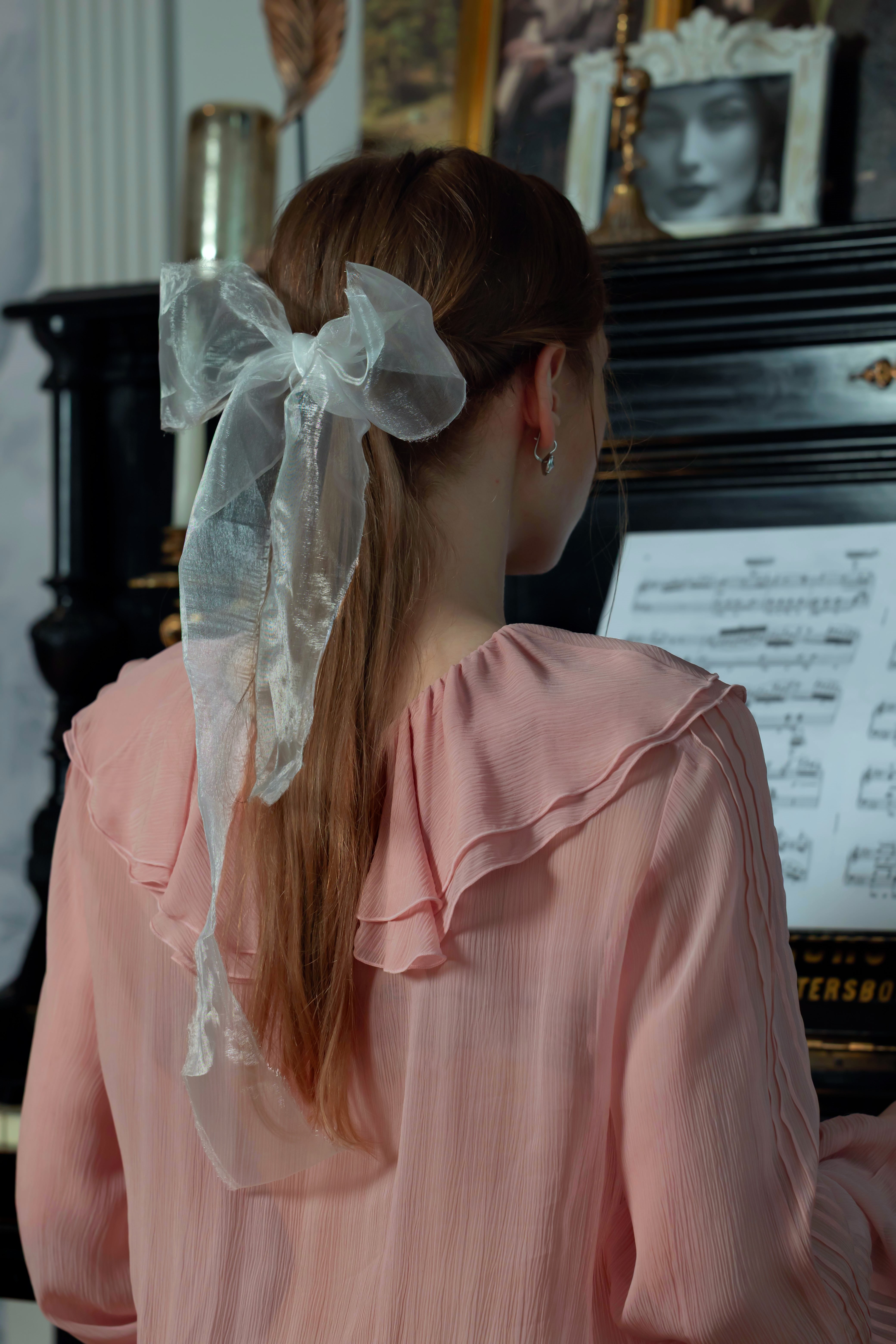 Девушка играет на пианино, розовое платье, бант, пианино, ноты, Герцен Наталья