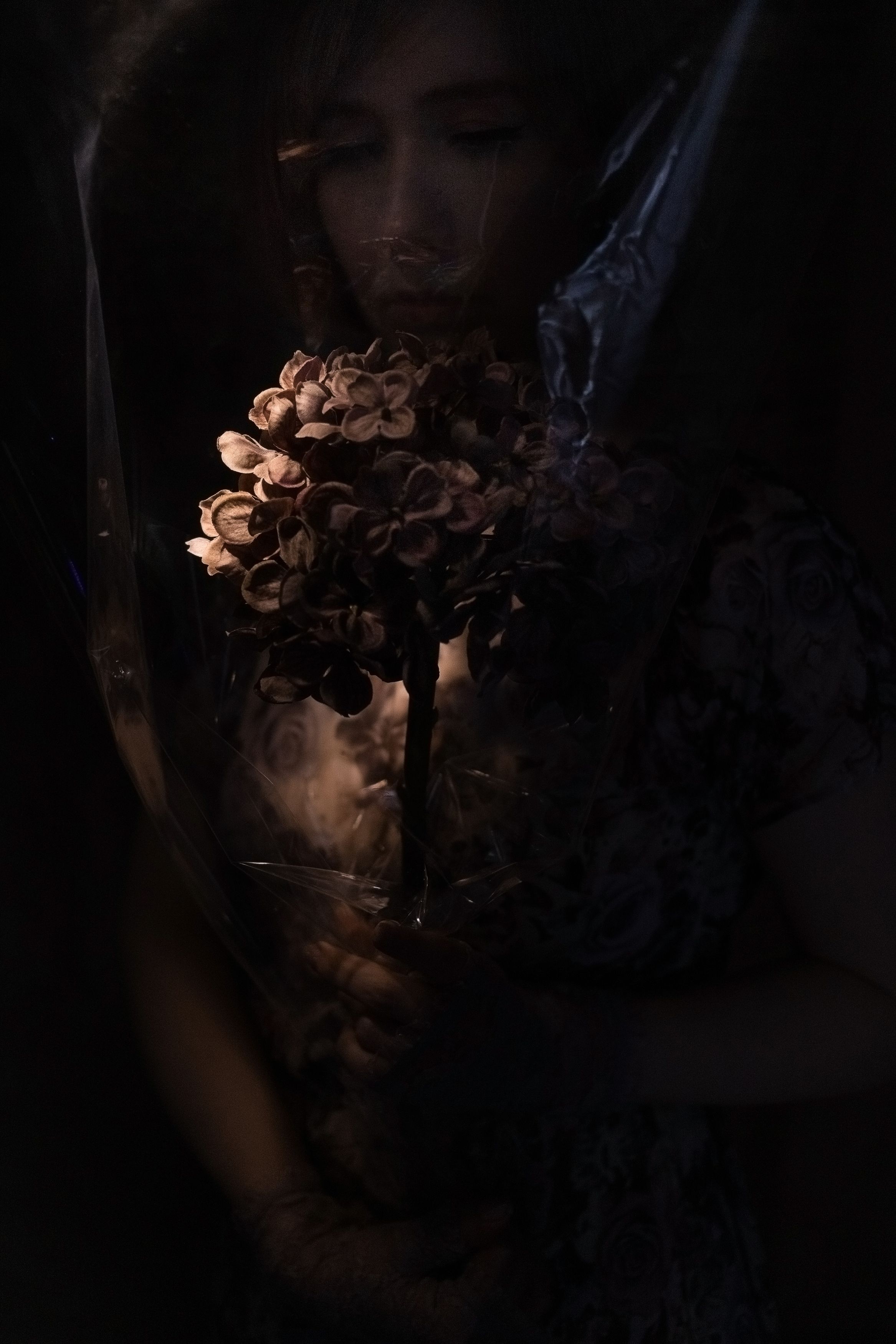 мне сложно дать описание любой своей работе. И зачастую я не понимаю, что должна пояснить... Искусственный цветок держит девушка, чье лицо закрыто слюдой. Что здесь больше наполнено жизнью .....