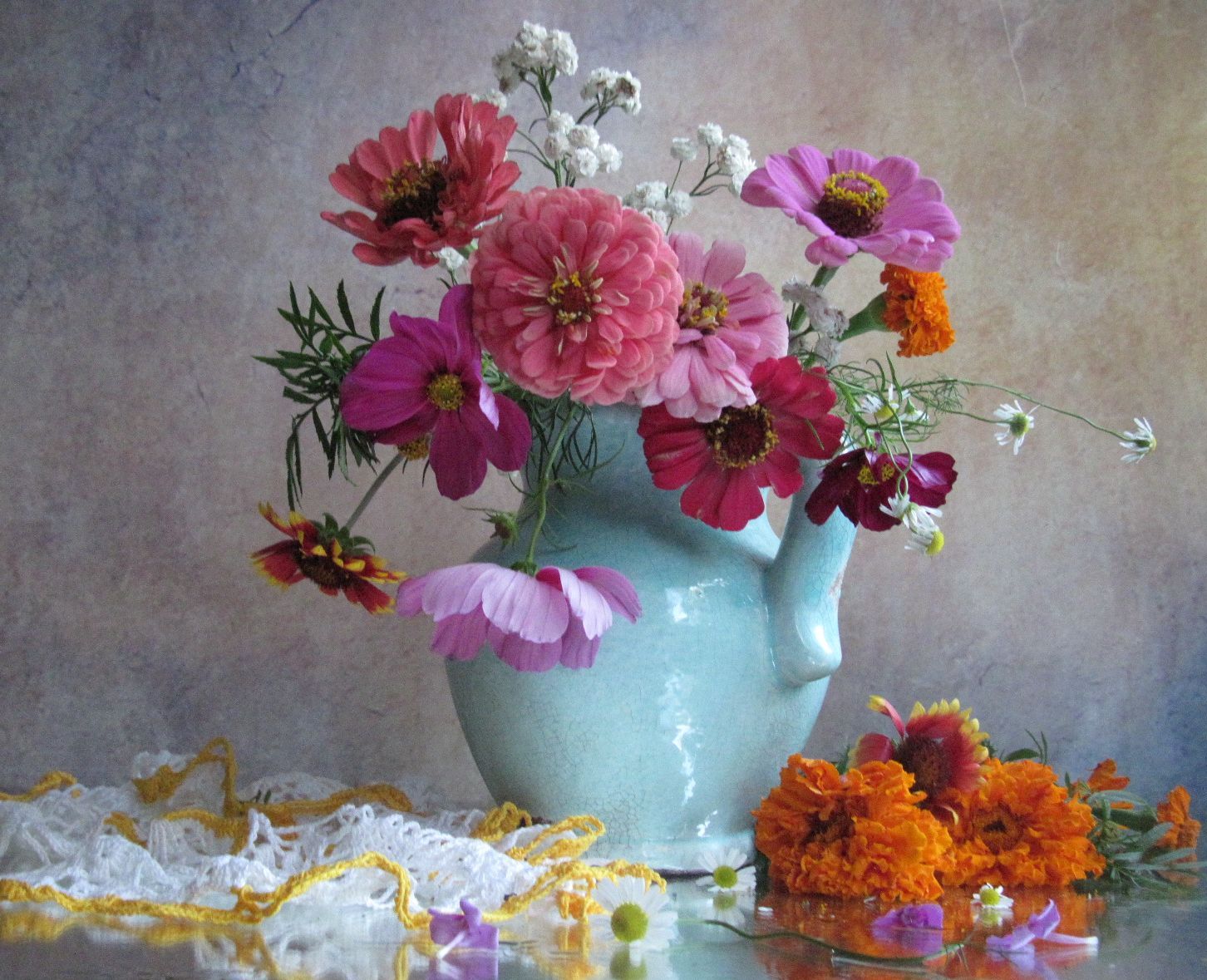 цветы, букет, циннии, космея, гипсофила, бархатцы, ромашки, Наталия Тихомирова