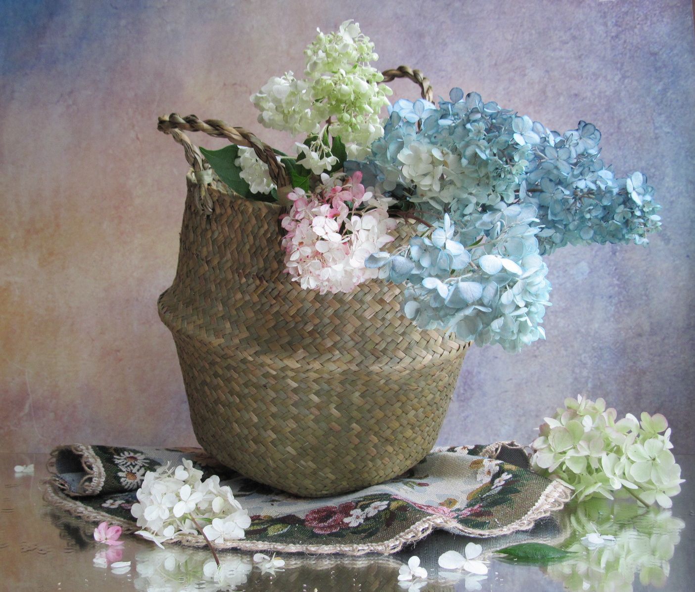 цветы, букет, гортензия, корзина, плетёнка, салфетка, гобелен, Наталия Тихомирова