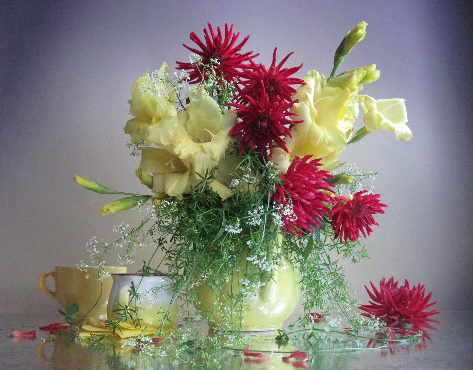 цветы, букет, гладиолусы, георгины, кувшин, кружки, Наталия Тихомирова
