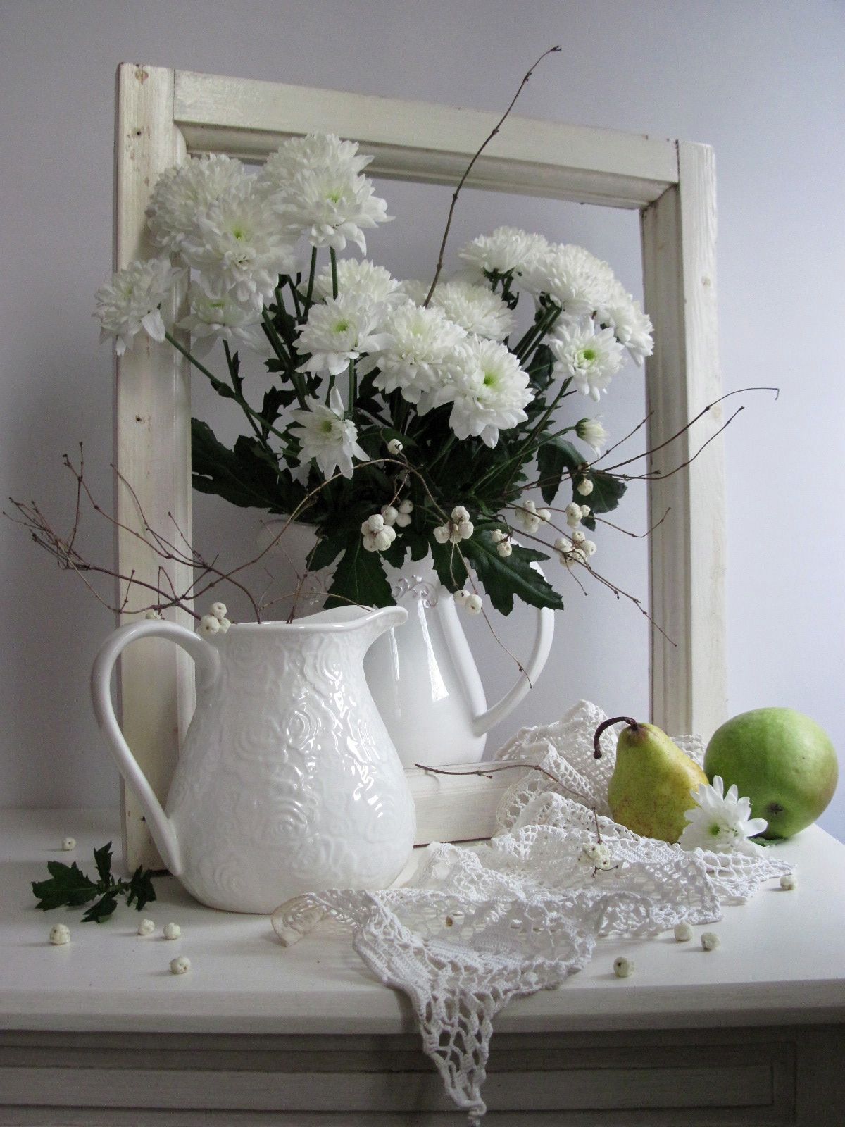 цветы, букет, хризантемы, керамика, фрукты, рама, кружево, белый цвет, Наталия Тихомирова